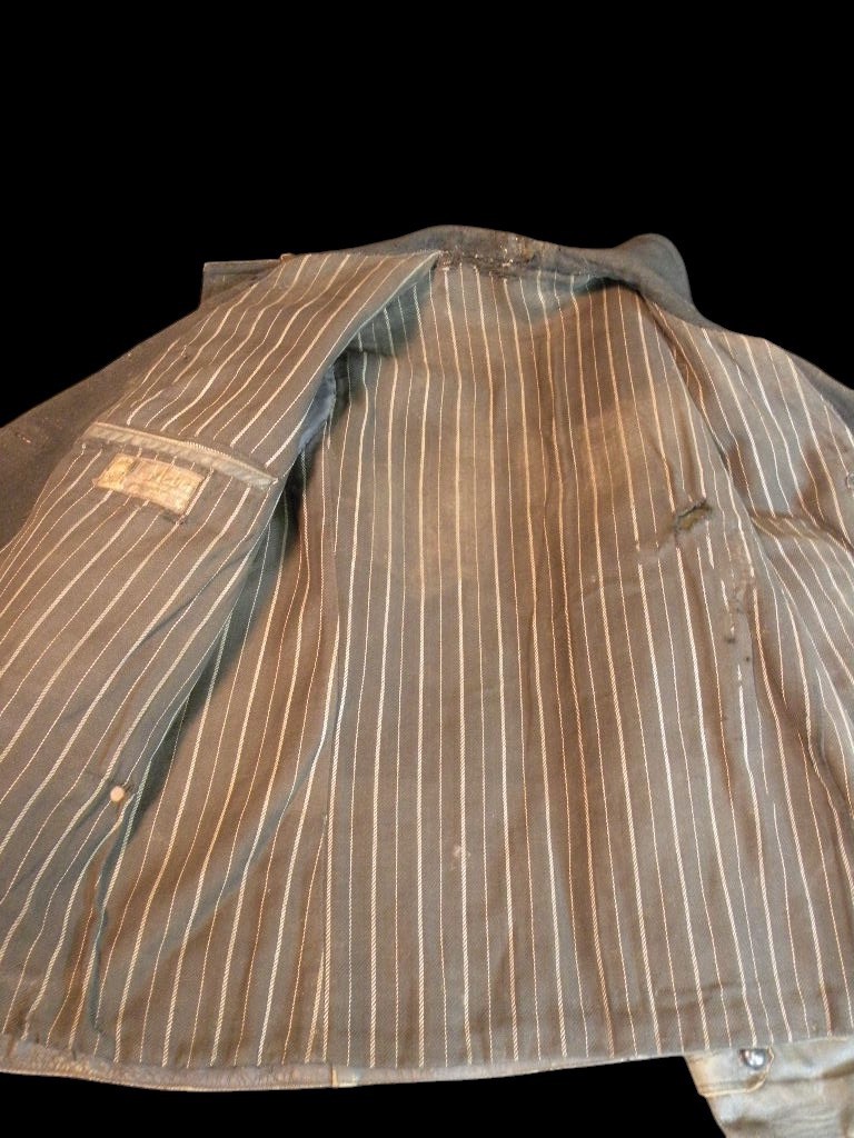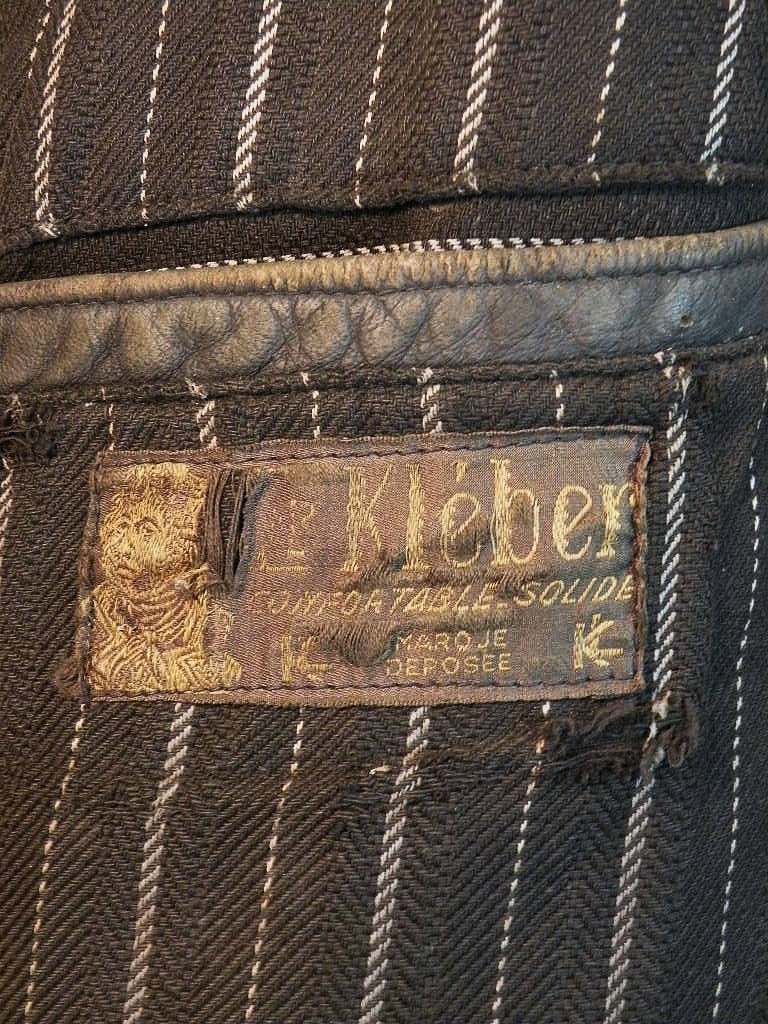 The interior provides excellent provenance. The jacket is lined with a unique dark fabric featuring vertical white pinstripes. A key feature is the original sewn-in manufacturerÕs label, partially visible in an interior pocket, marked Klber with text confirming the quality CONFORTABLE SOLIDE and a trademark. This manufacturerÕs tag confirms it as a high-quality, period-manufactured garment.