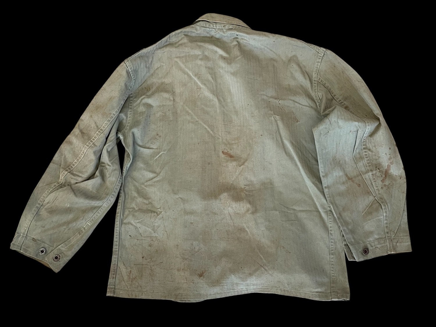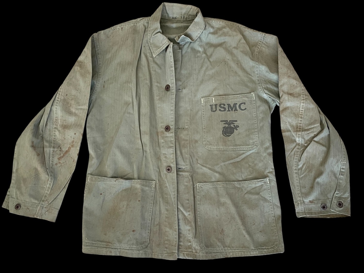 The coat features a button-up front closure with all buttons present and displays genuine field-worn character. The HBT fabric shows fading and discoloration consistent with decades of service and storage, giving it an appealing, used patina. The construction is solid and complete. This piece is a quintessential representation of the Marine Corps uniform during the most critical periods of the 20th century, making it a foundation piece for any World War Two Pacific Theater collection.