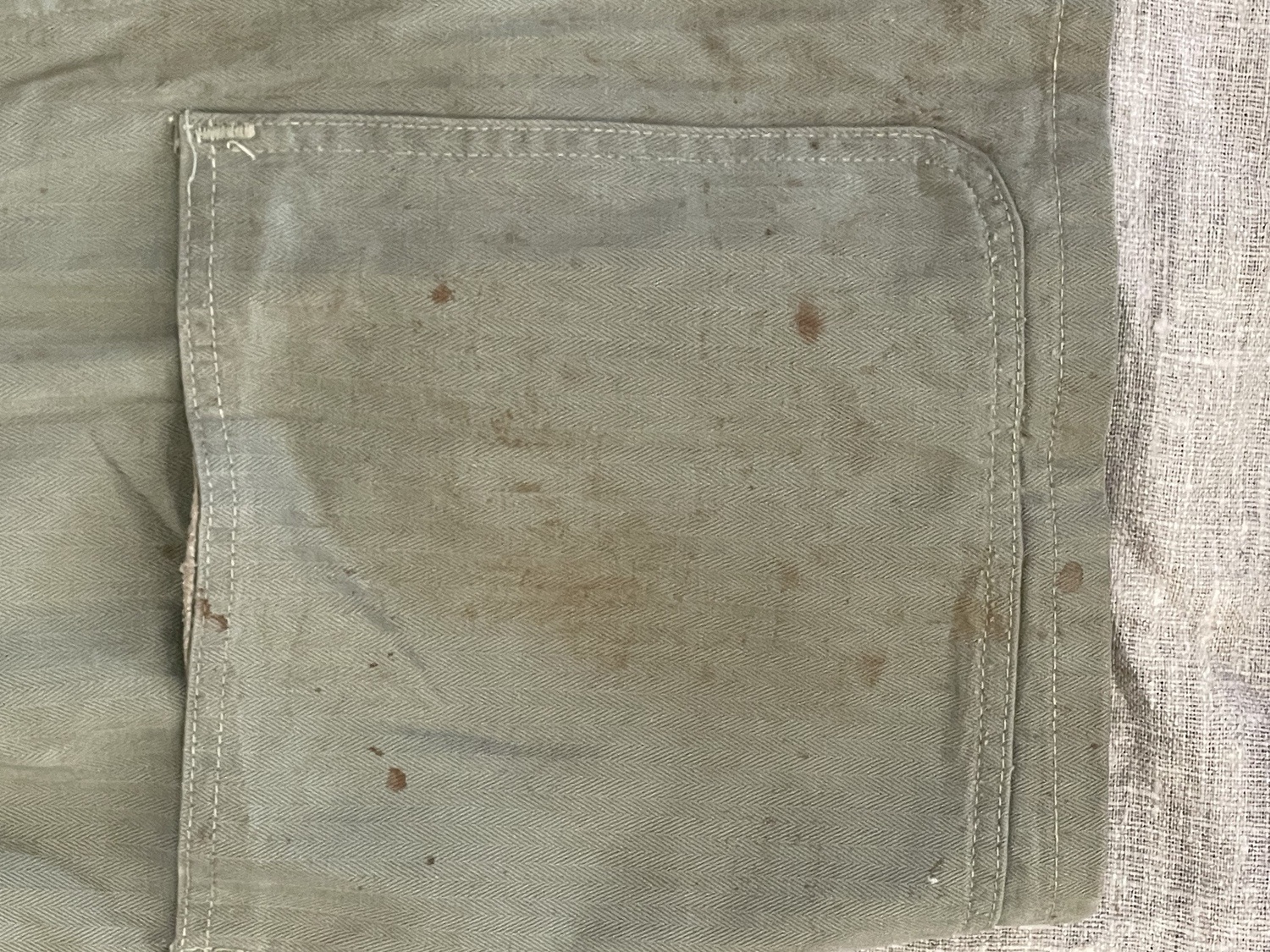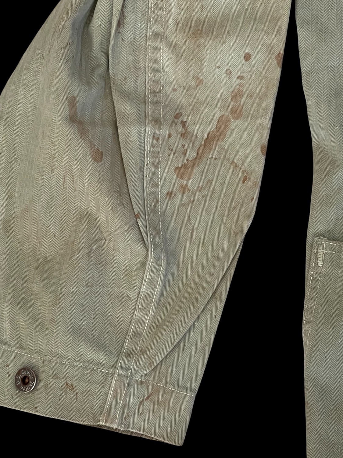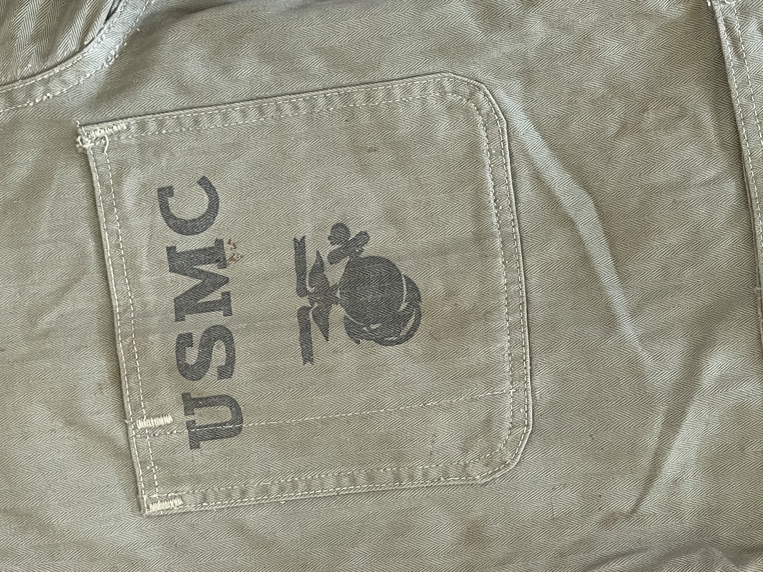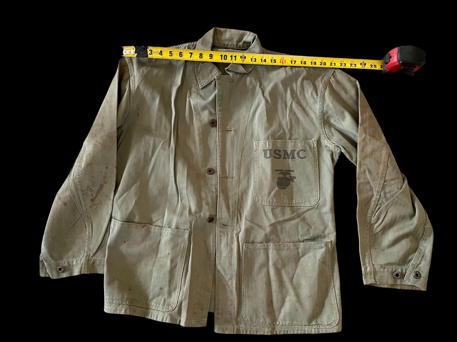 This is an original and authentic United States Marine Corps USMC P-41 Pattern 1941 Utility Jacket, crafted from durable Herringbone Twill HBT fabric. This jacket is the definitive utility uniform worn by U.S. Marines throughout the Pacific campaigns of World War Two, from Guadalcanal through Iwo Jima, and it continued service into the Korean War.