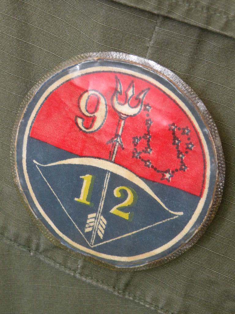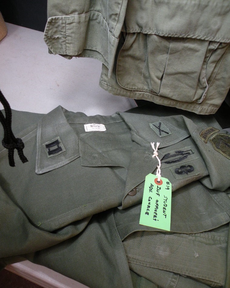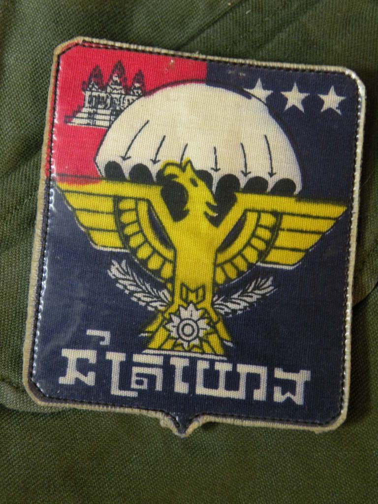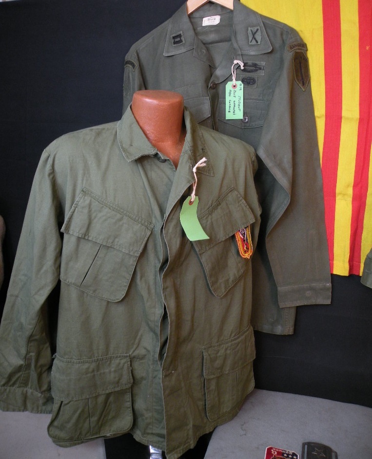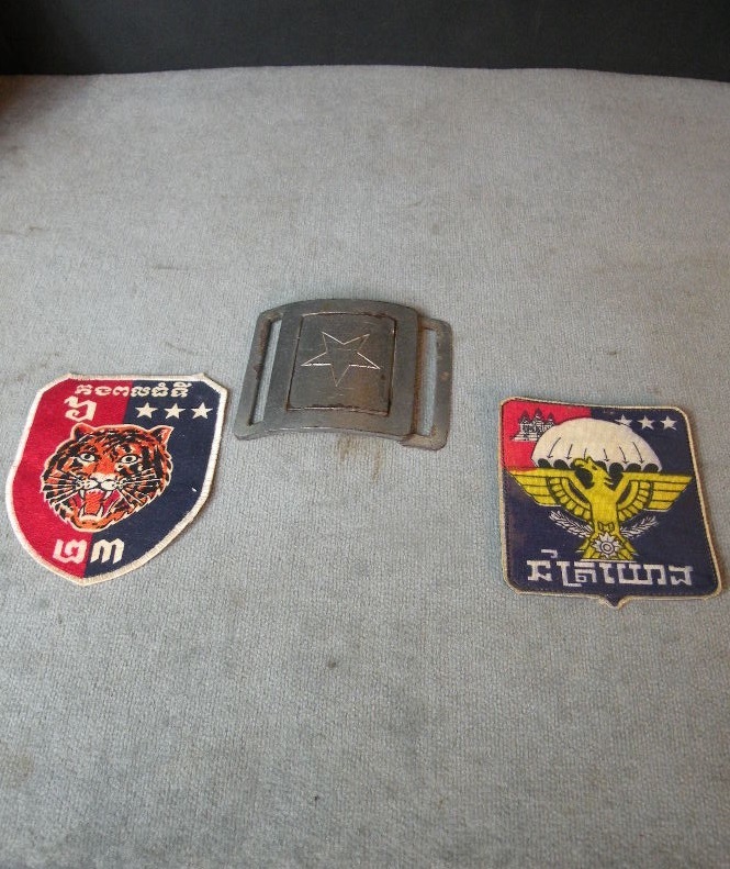 The pin on pocket hanger with bow, on his sterile set of fatigues, is the Cambodian 12TH Brigade of the 9TH Infantry of which he was an Advisor and combatant with. The other pocket hanger was a badge he was given to enter the Cambodian Capital Palace. Besides the 2 jungle jackets there are a couple of other shirts, some insignia removed. The loose patches include his pin on Cambodian Airborne pocket patch, pin now missing from the back, as well as a second patch with an interesting story. The green labels were filled out and put on by this Officer. The Tiger patch was given to him by a Cambodian in that unit. Their base allowed families to live with them. The NVA and VC overran their base and wiped out everyone, including the families, so the unit ceased to exist at that point. The NVA buckle was an item he captured, and the South Vietnamese flag was one of his bring back trophies. The photos are not originals; he is retaining those