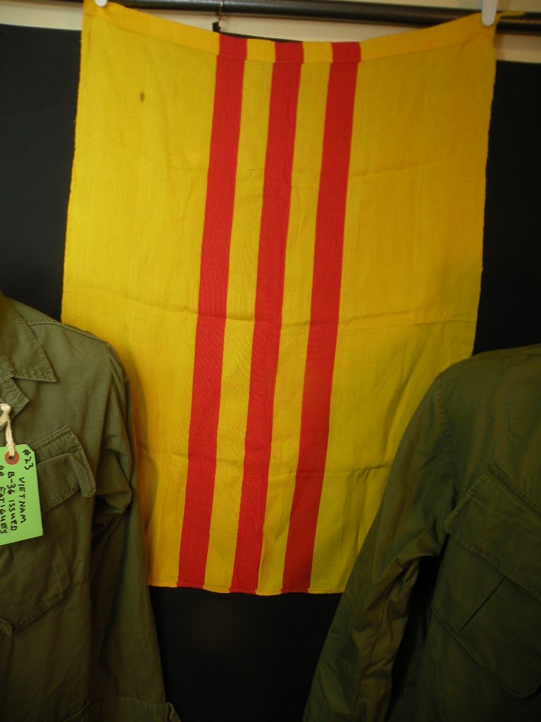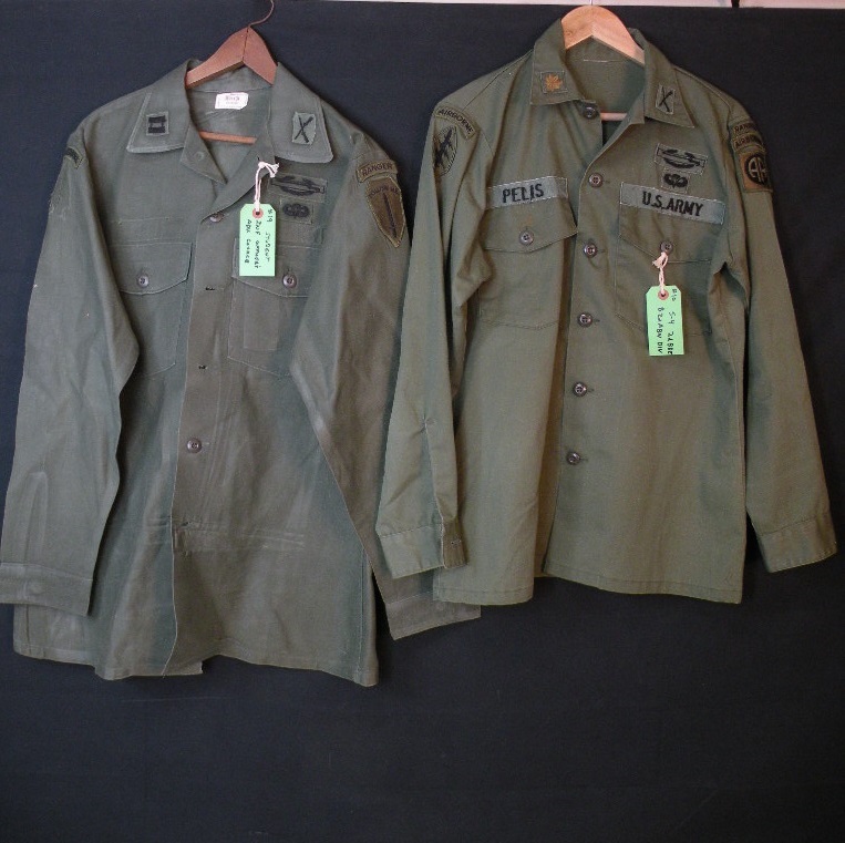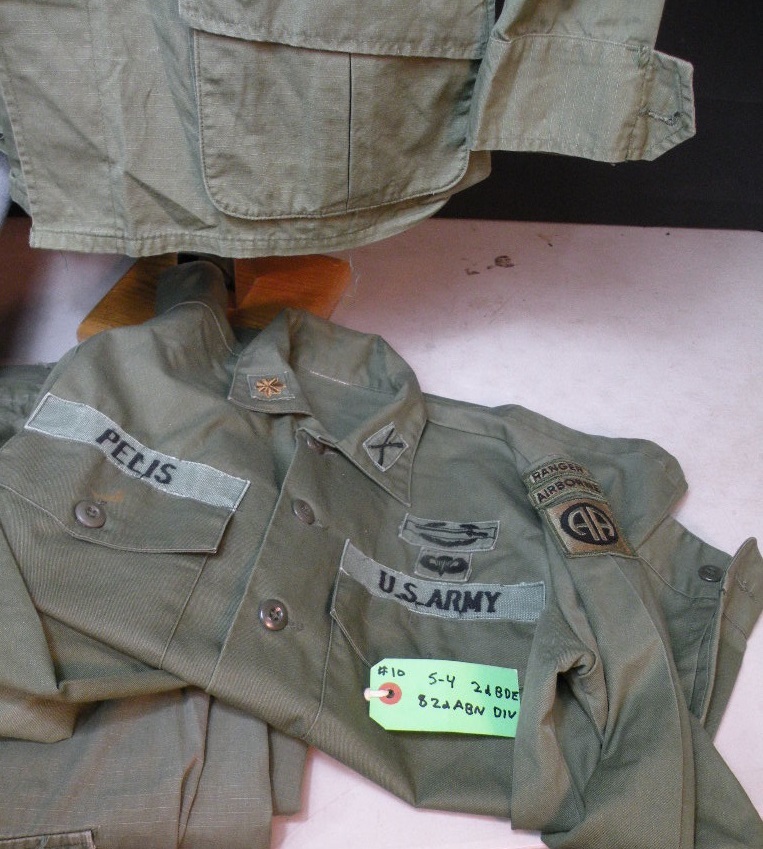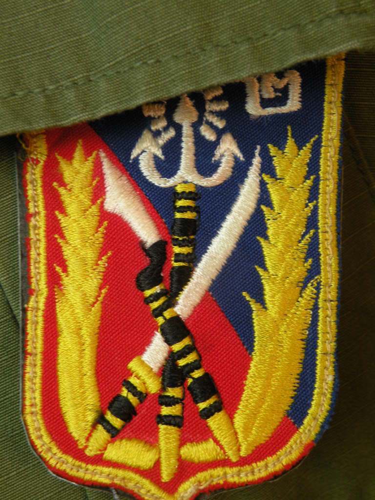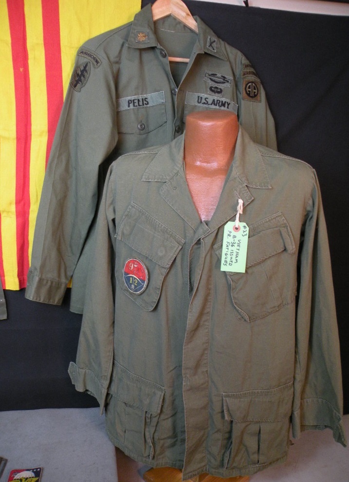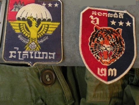 The pin on pocket hanger with bow, on his sterile set of fatigues, is the Cambodian 12TH Brigade of the 9TH Infantry of which he was an Advisor and combatant with. The other pocket hanger was a badge he was given to enter the Cambodian Capital Palace. Besides the 2 jungle jackets there are a couple of other shirts, some insignia removed. The loose patches include his pin on Cambodian Airborne pocket patch, pin now missing from the back, as well as a second patch with an interesting story. The green labels were filled out and put on by this Officer. The Tiger patch was given to him by a Cambodian in that unit. Their base allowed families to live with them. The NVA and VC overran their base and wiped out everyone, including the families, so the unit ceased to exist at that point. The NVA buckle was an item he captured, and the South Vietnamese flag was one of his bring back trophies. The photos are not originals; he is retaining those