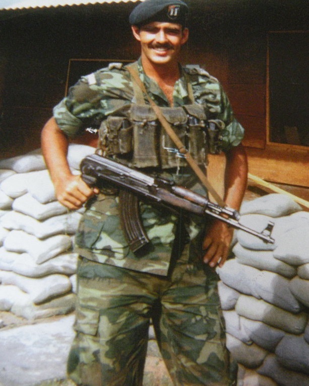 Includes uniforms he was issued before and during his time in Vietnam. He entered service in 1969 and served until 1999. When he landed in Vietnam he was originally assigned to CCN, but when he arrived he was told that his place had been taken by another. He then was assigned to the Individual Training Group program and ended up with FANK training the Khmer. He is shown wearing his FANK beret flash on his beret. He ran the mission programs of Cambodian troops being trained and tested against the NVA. He was assigned to Camp B-36 and was also in charge of A-Team, A-363. His call sign was -Duster 66-.