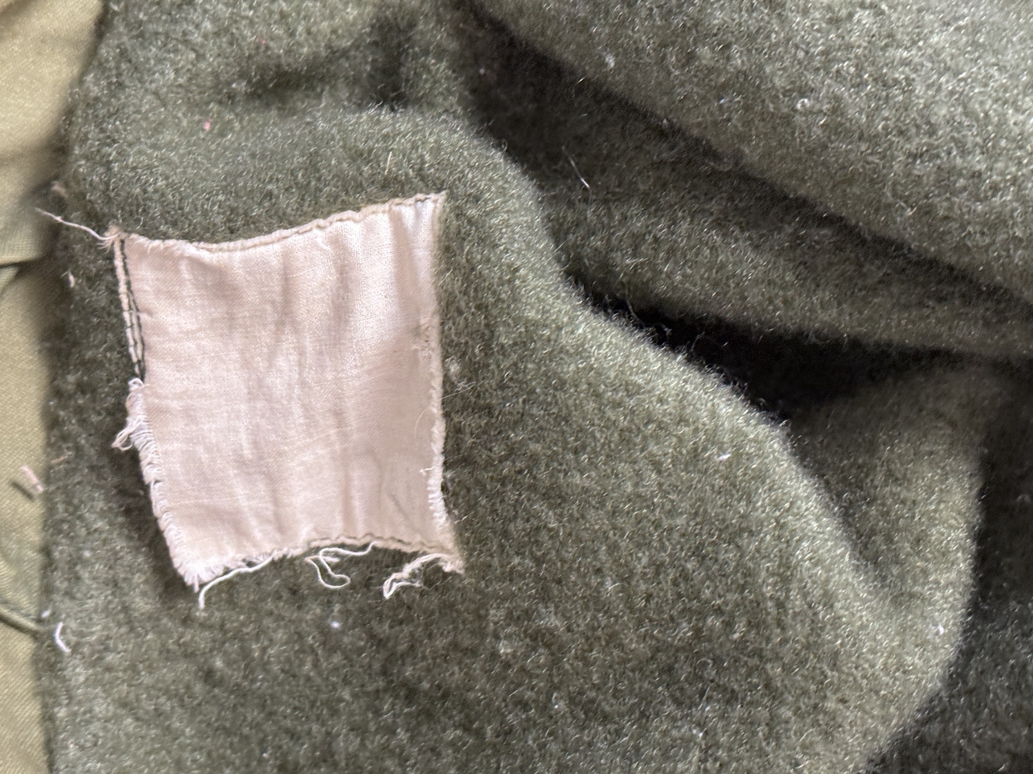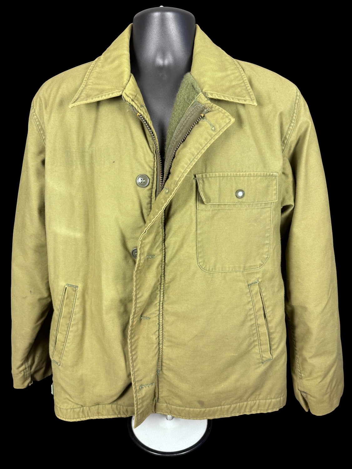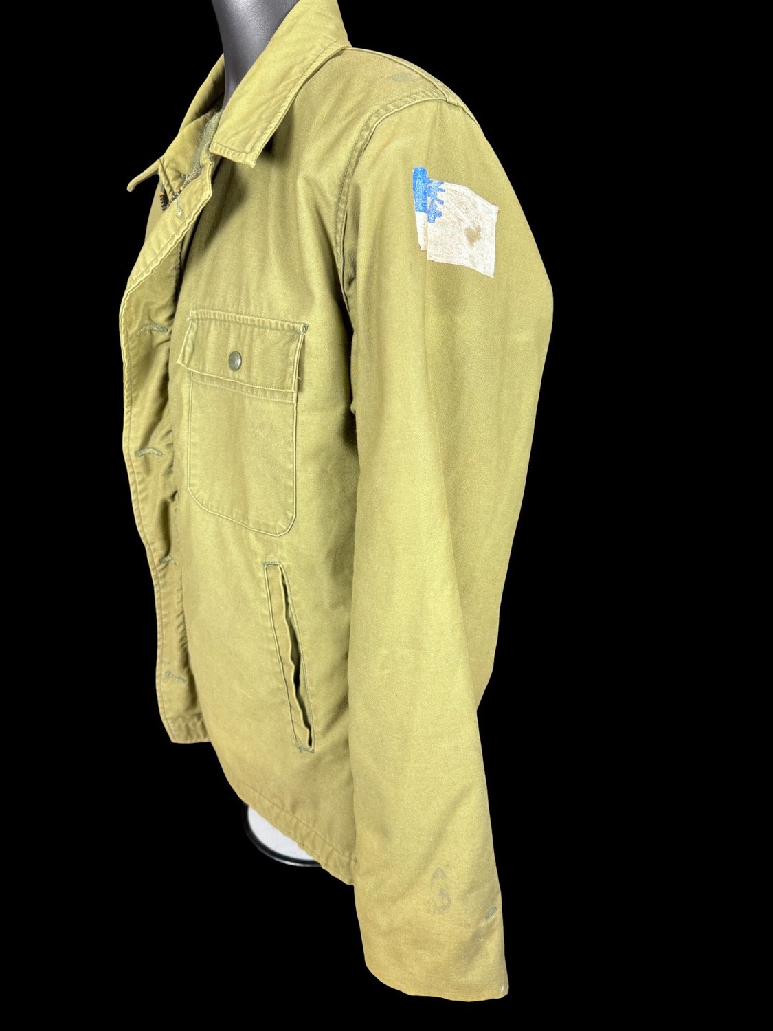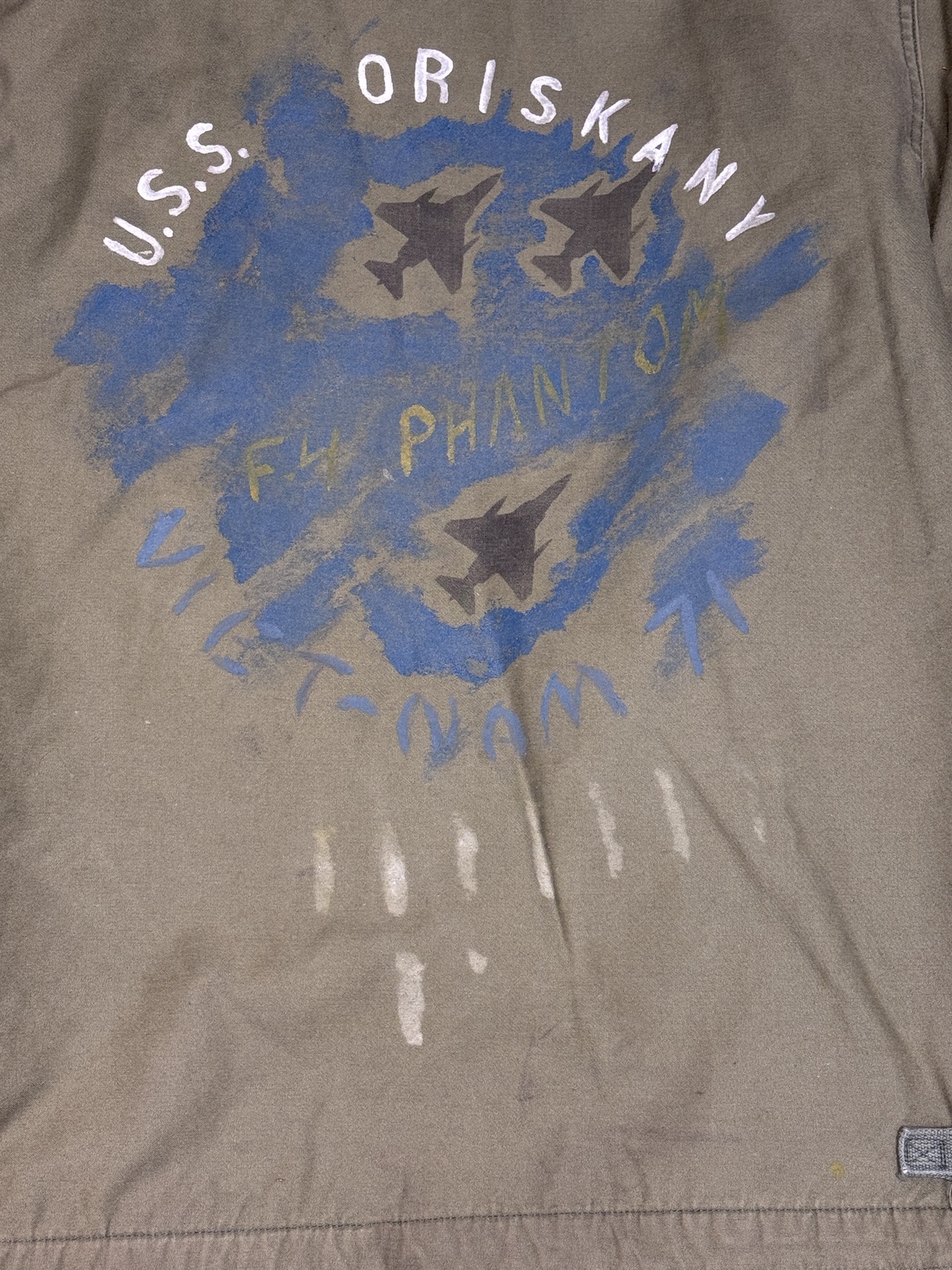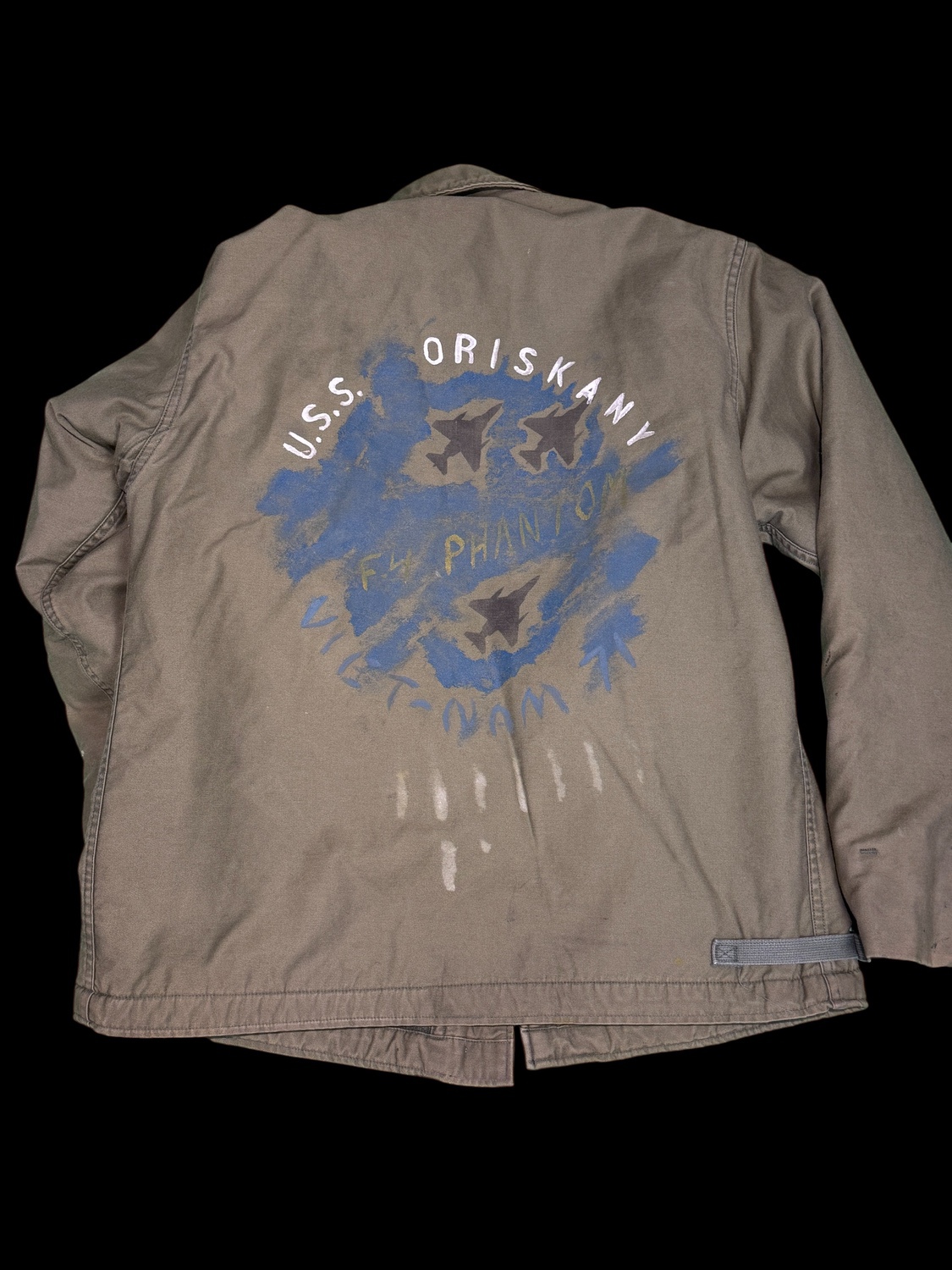 washed out label. Left shoulder has a washed out painted flag. Back of jacket has the following: faded but visible diorama painting on it: USS Oriskany, outline of three F4Phantom, Viet Nam, outline of seven bombs