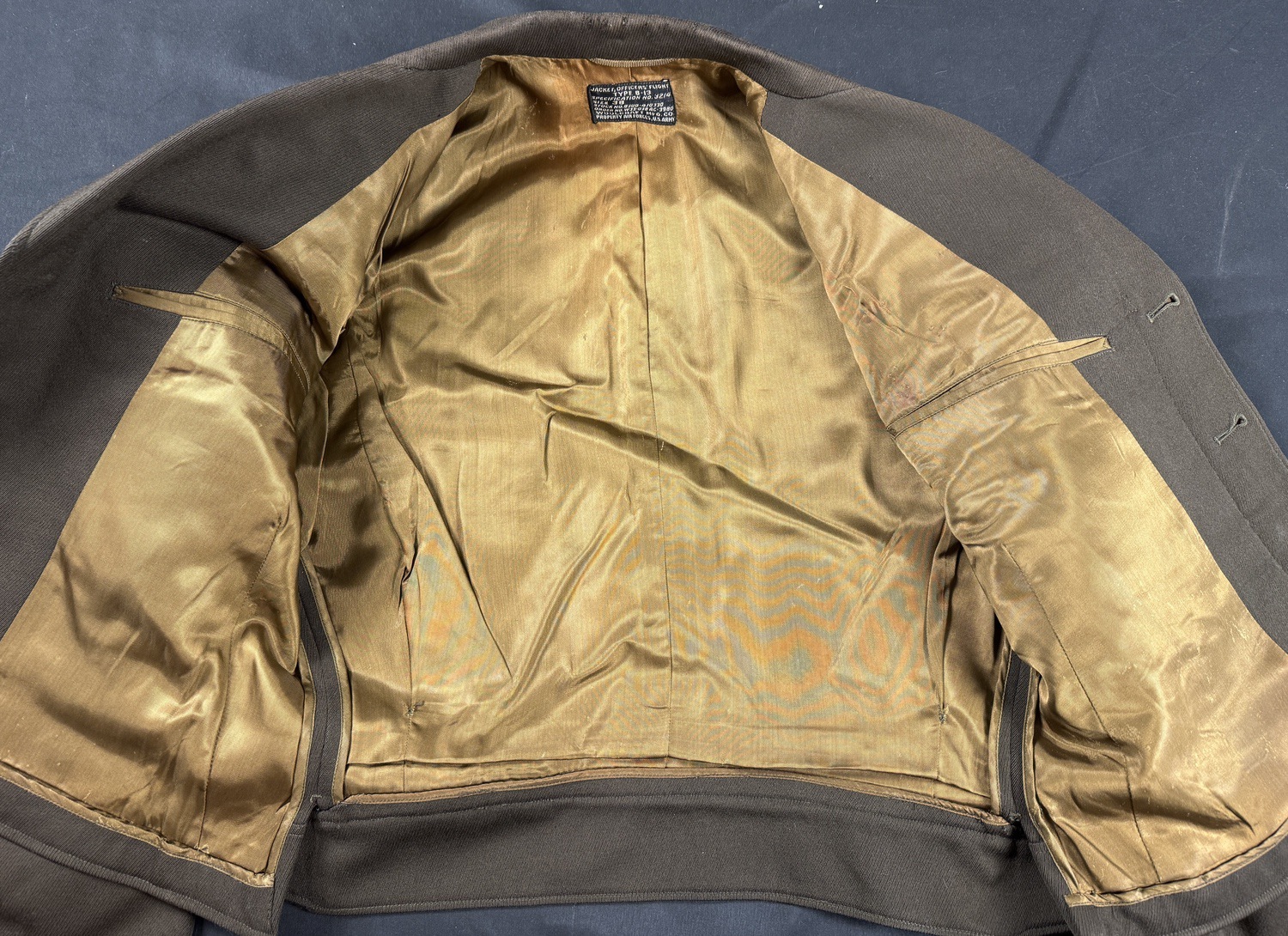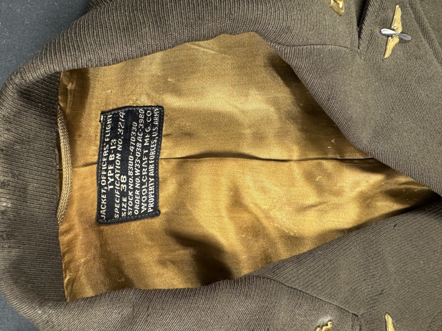 Constructed of Olive Drab wool or gabardine, the jacket features the classic short cut with a zip front design, shown here in the open position. The collar is finished in brown corduroy, while the interior retains its bright gold orange rayon satin lining, a hallmark of officer grade garments. The original US Government specification label remains intact inside the collar, reading JACKET OFFICERS FLIGHT TYPE B 13 SIZE 38 and manufactured by Woolcraft Mfg Co under 1942 1943 contract.