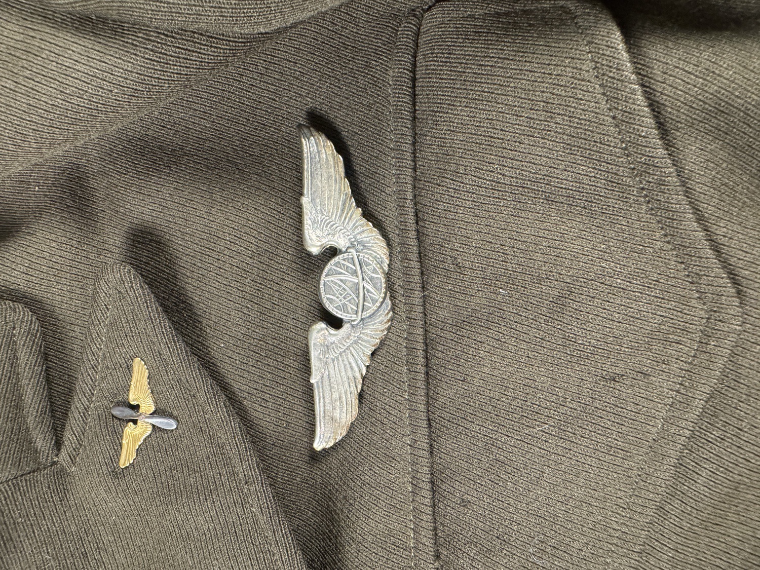 The jacket carries a full set of period applied insignia. The left shoulder displays the embroidered Shoulder Sleeve Insignia of the 7th Army Air Force, a unit that served extensively throughout the central Pacific. The collar points are fitted with miniature branch insignia. Above the left breast pocket is a full size silver toned USAAF Navigator Wing, a three inch sterling badge marked AE Co on the reverse for the respected maker A E Company. A miniature pilot or command pilot wing is mounted on the pocket flap below.