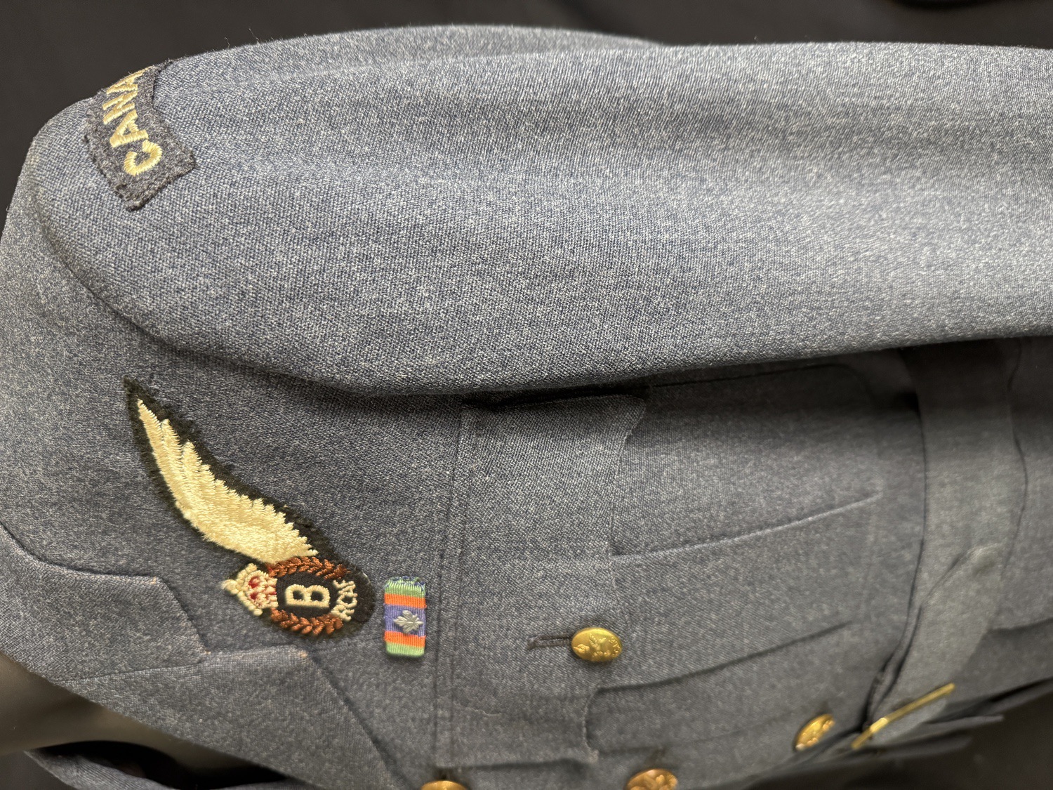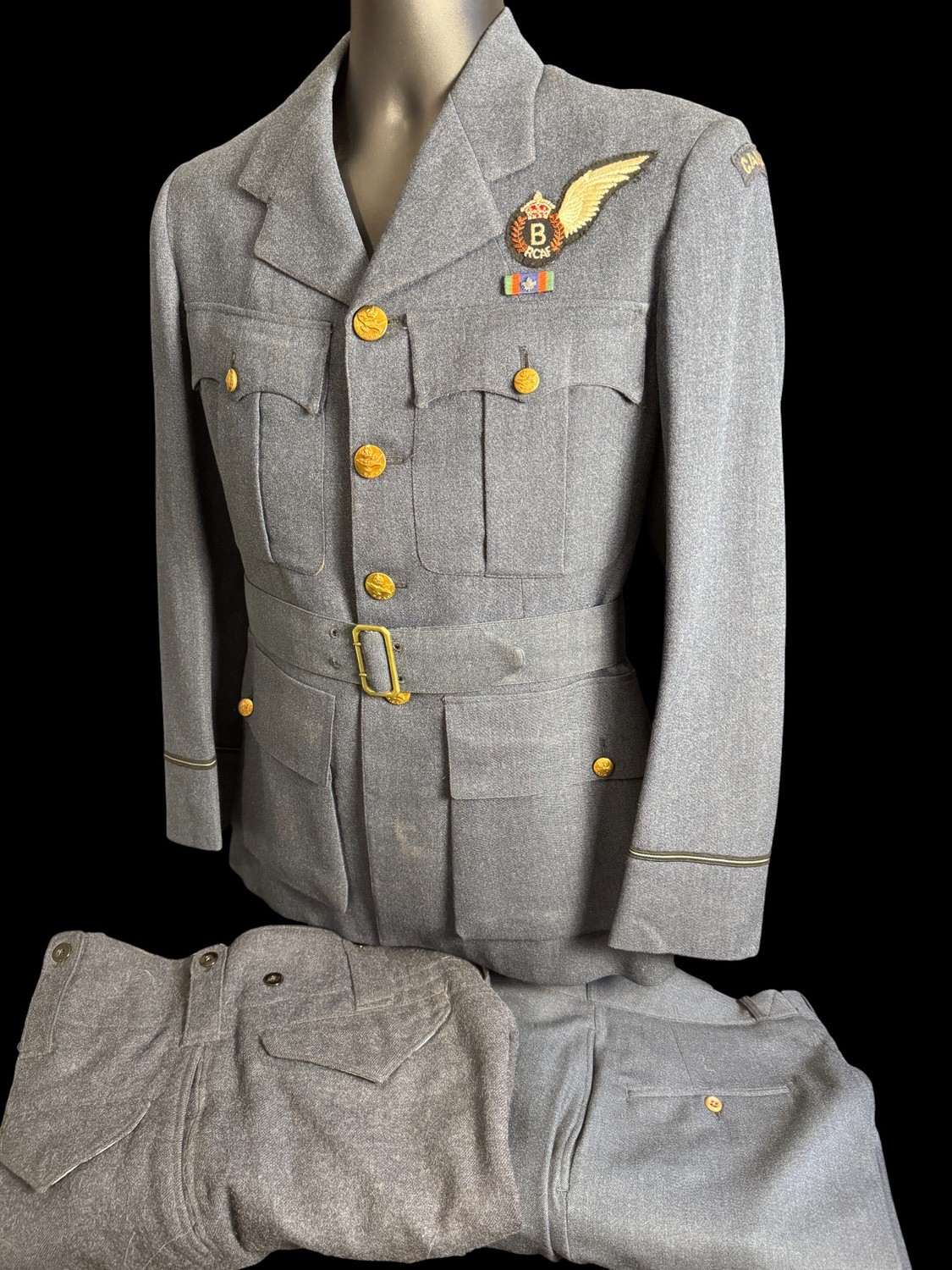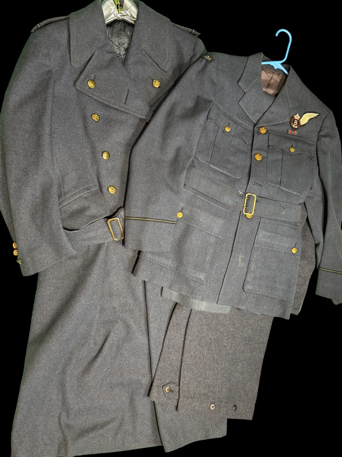 WWII RCAF Service Uniform. Blouse, trousers and overcoat. Bomb Aimers brevet, Service Ribbon. Canada shoulder titles .Uniform is in Excellent Condition