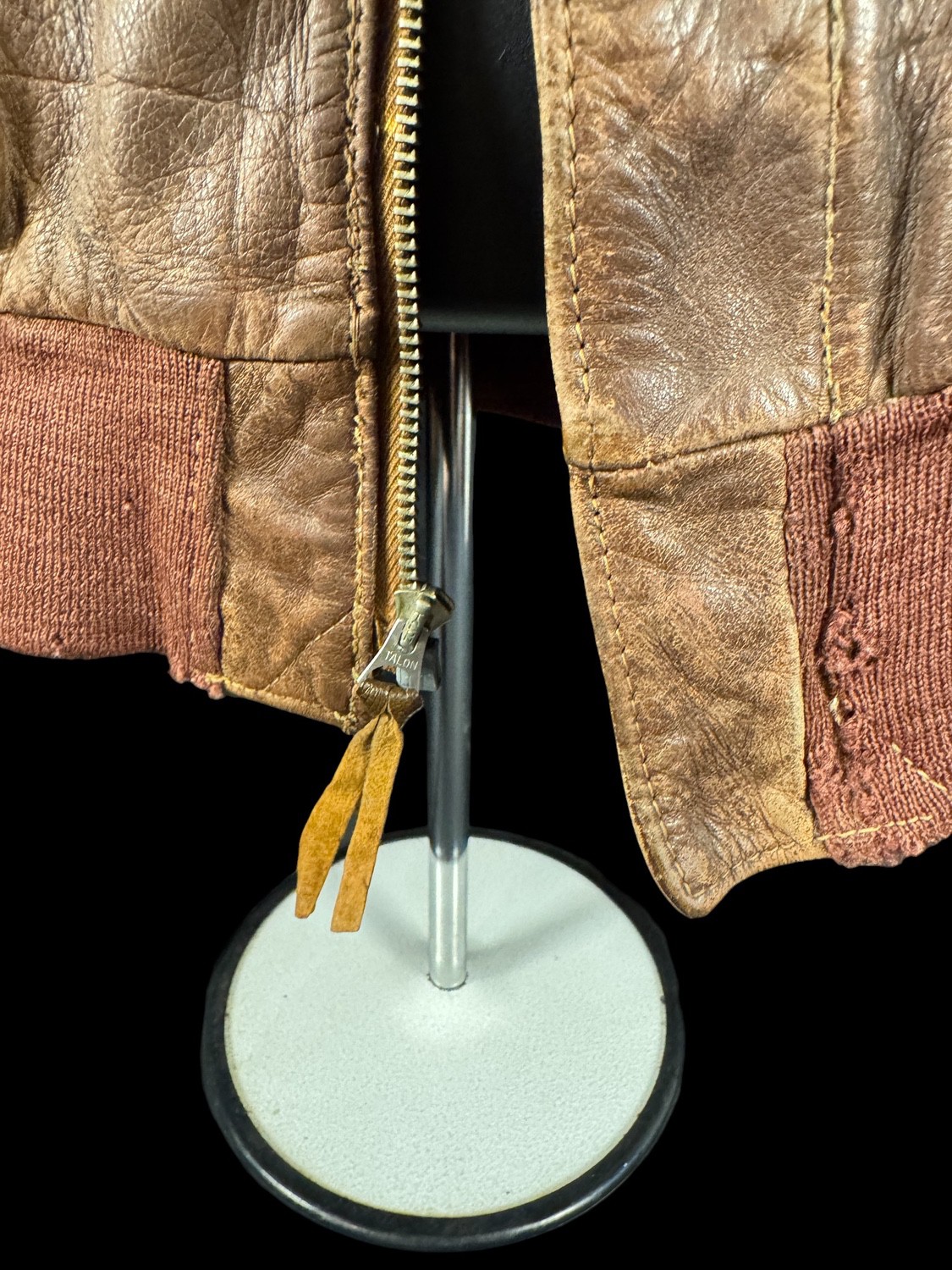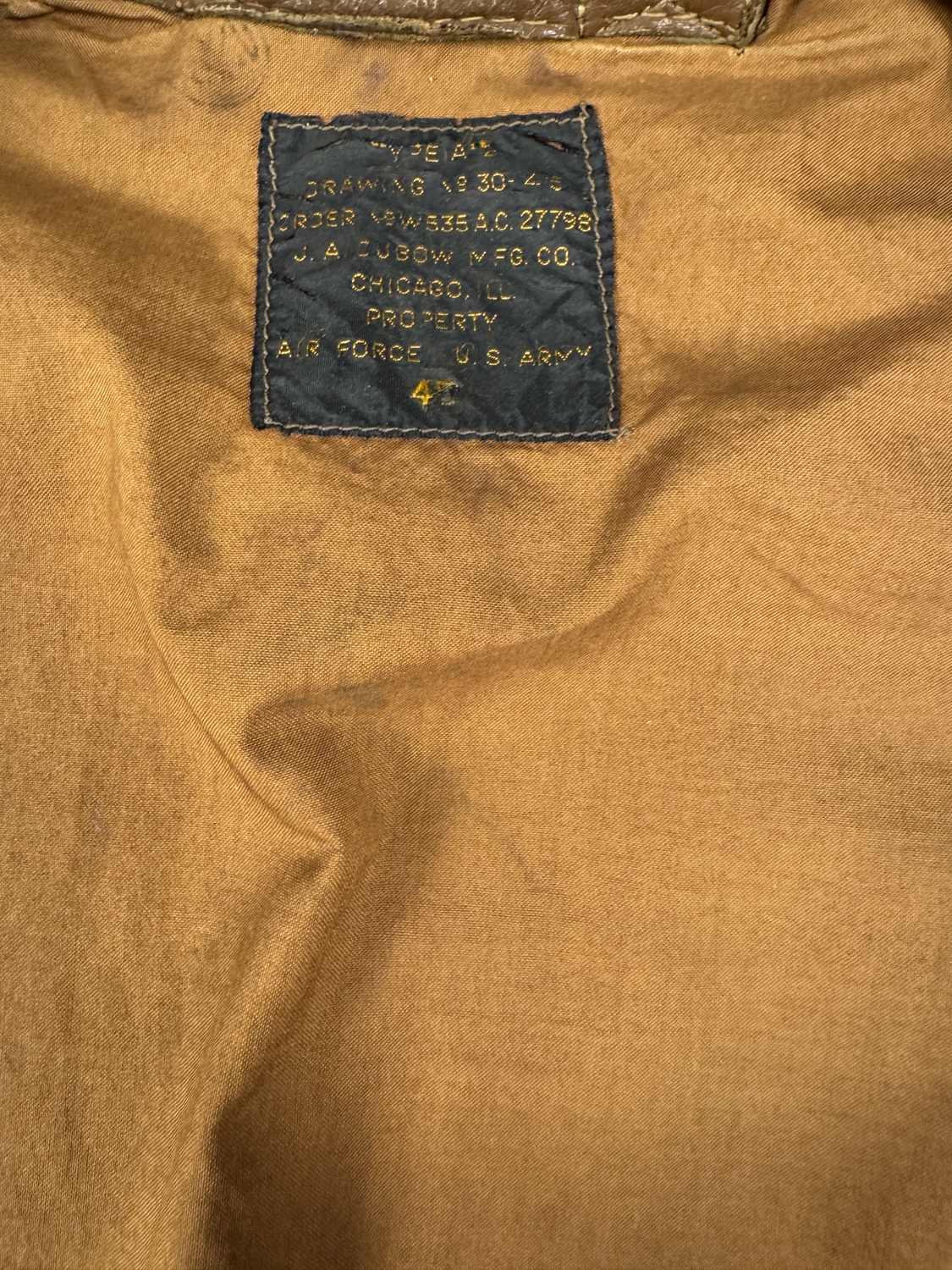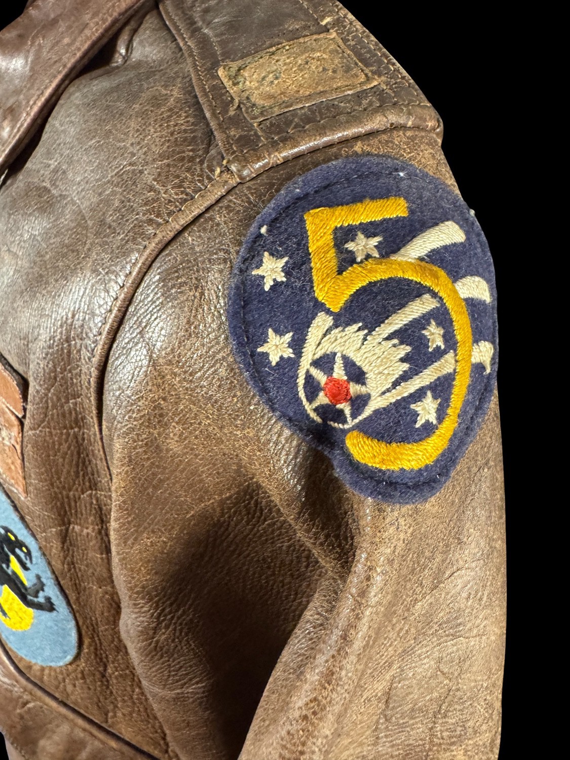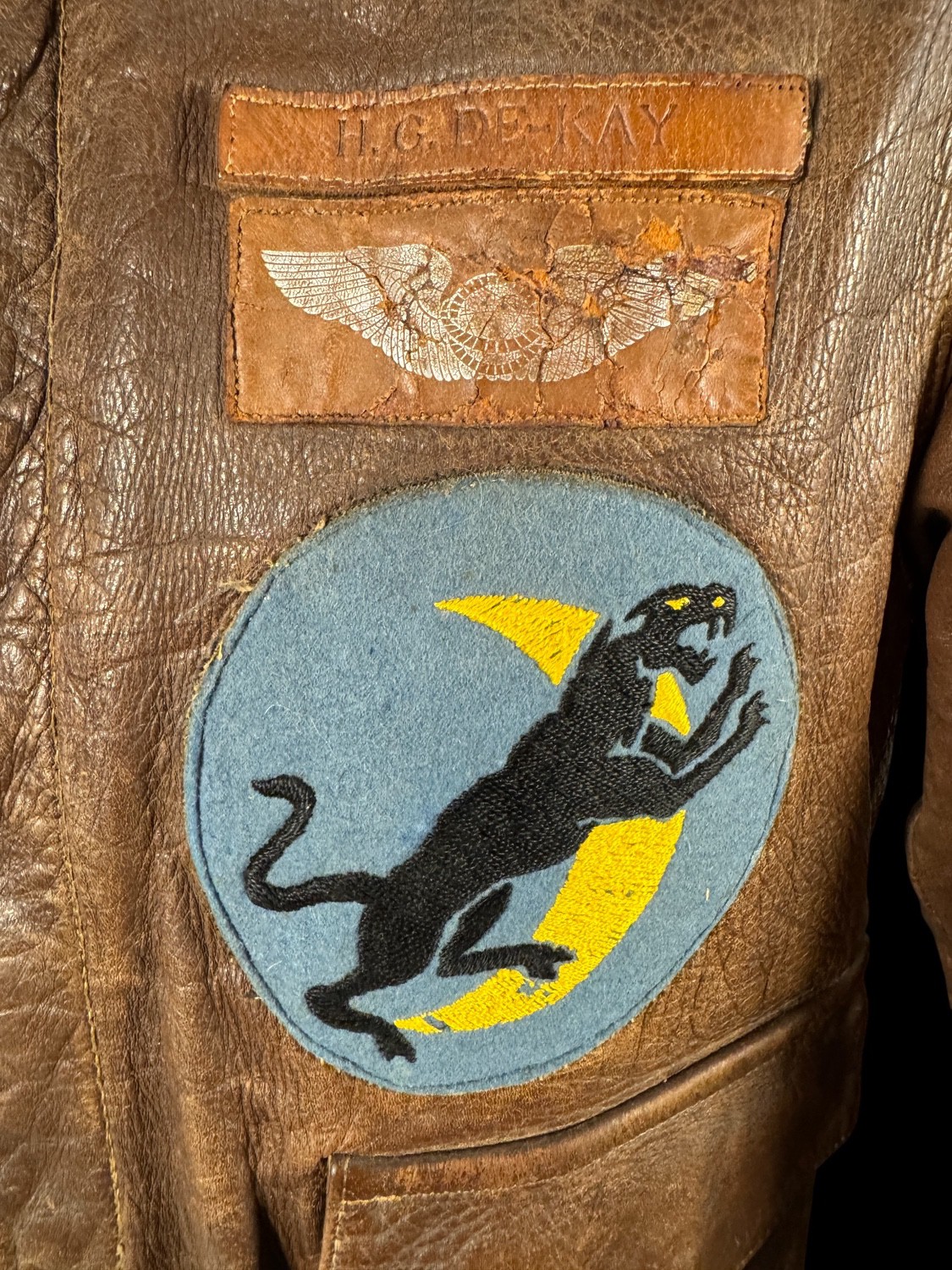 The core of the ensemble is an original TYPE A-2 Leather Flight Jacket, constructed by the highly regarded J.A. ZUBOW MFG. CO. of Chicago, IL, as confirmed by the clear collar specification tag. The leather exhibits a deep, rich brown patina and wear consistent with service in the Southwest Pacific Theater. The jacket is heavily personalized, featuring a leather name tag hand-stamped H. G. DEKAY above a faded Pilot Wing decal or painted insignia. The lower pocket is adorned with a large, beautifully embroidered -Black Panther- Squadron Patch on a blue field with a yellow crescent moon. This patch is the insignia for the 501st Bomb Squadron, a unit within the 345th Bomb Group The Air Apaches. The left shoulder is affixed with the distinctive 5th Air Force Patch, an organization that led the air campaign in the Southwest Pacific.