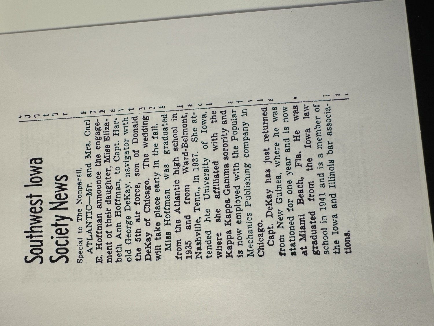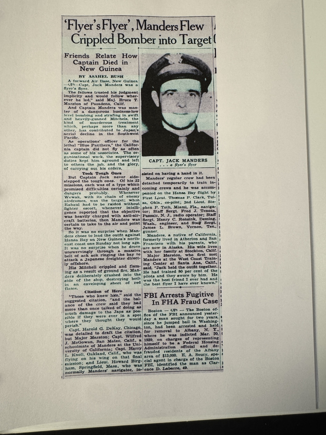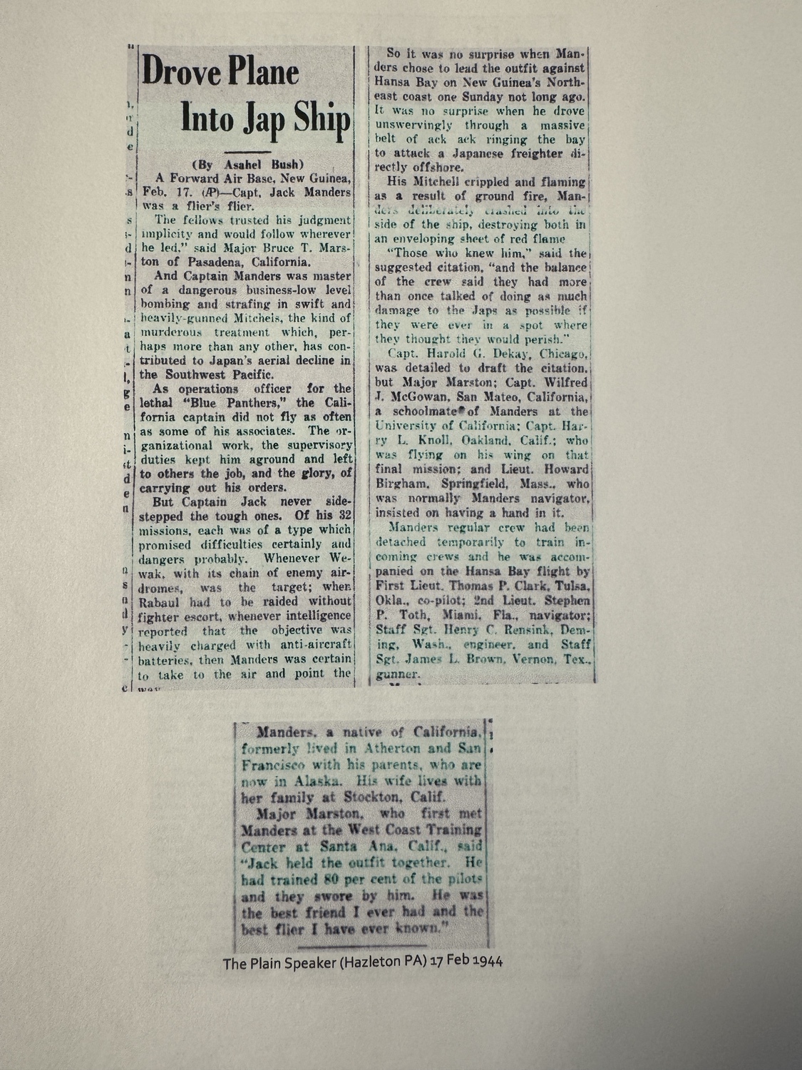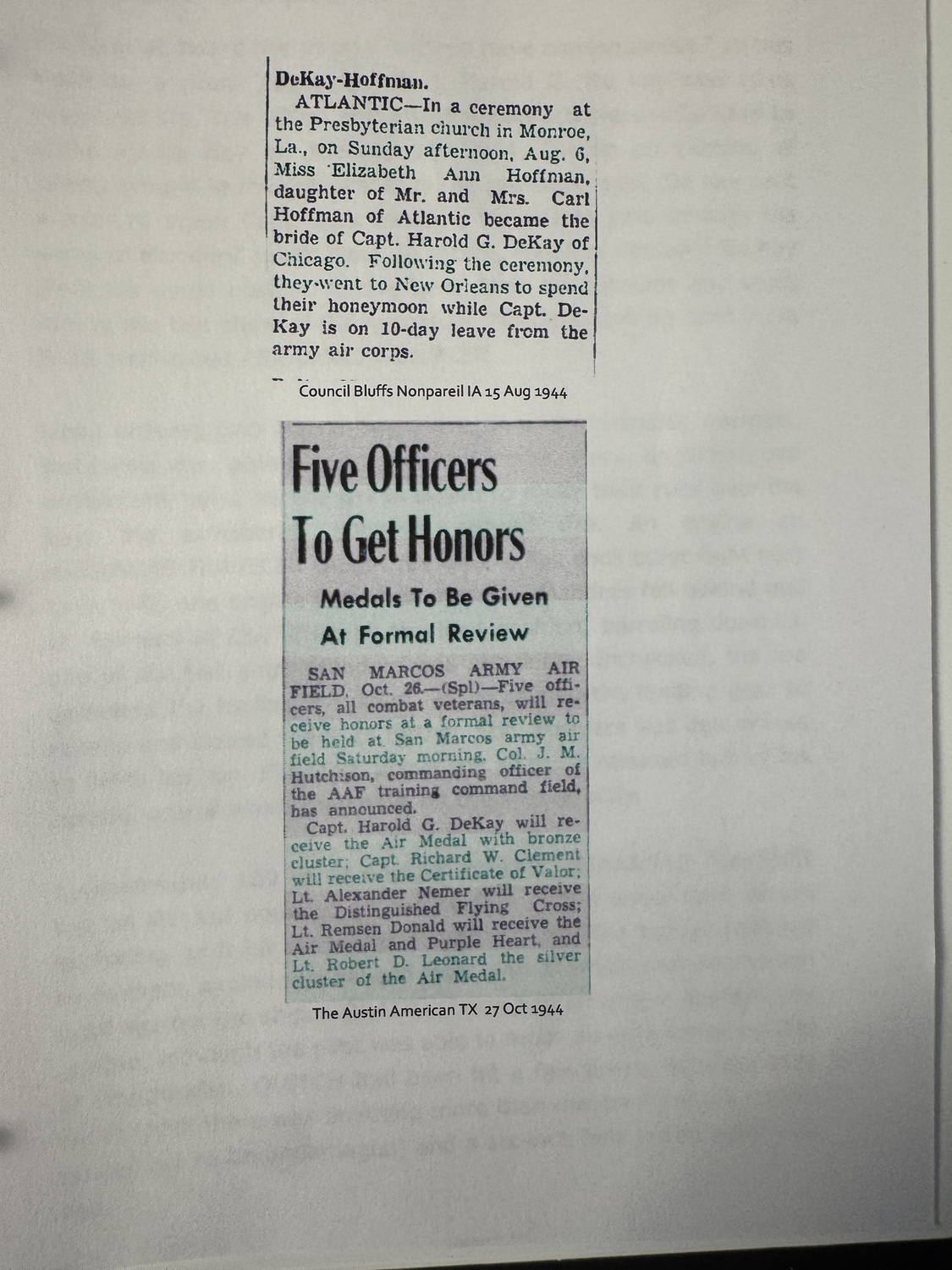 The unparalleled provenance is provided by the accompanying archive of original newspaper clippings dating from 1944. These clippings confirm key details: Captain DeKay is identified as a navigator for the 5th Air Force stationed in New Guinea, part of a mission where his pilot, Jack Manders, drove his crippled bomber into a Japanese warship, an incident that ties directly to the 345th BG s low-level -skip bombing- tactics. Clippings explicitly state Capt. Harold G. DeKay will receive the Air Medal with bronze cluster, and mentions his wedding and rank advancement. The articles link him directly to the -Blue Panthers- of the 5th Air Force, tying the narrative directly to the rare 501st Bomb Squadron patch on the jacket.