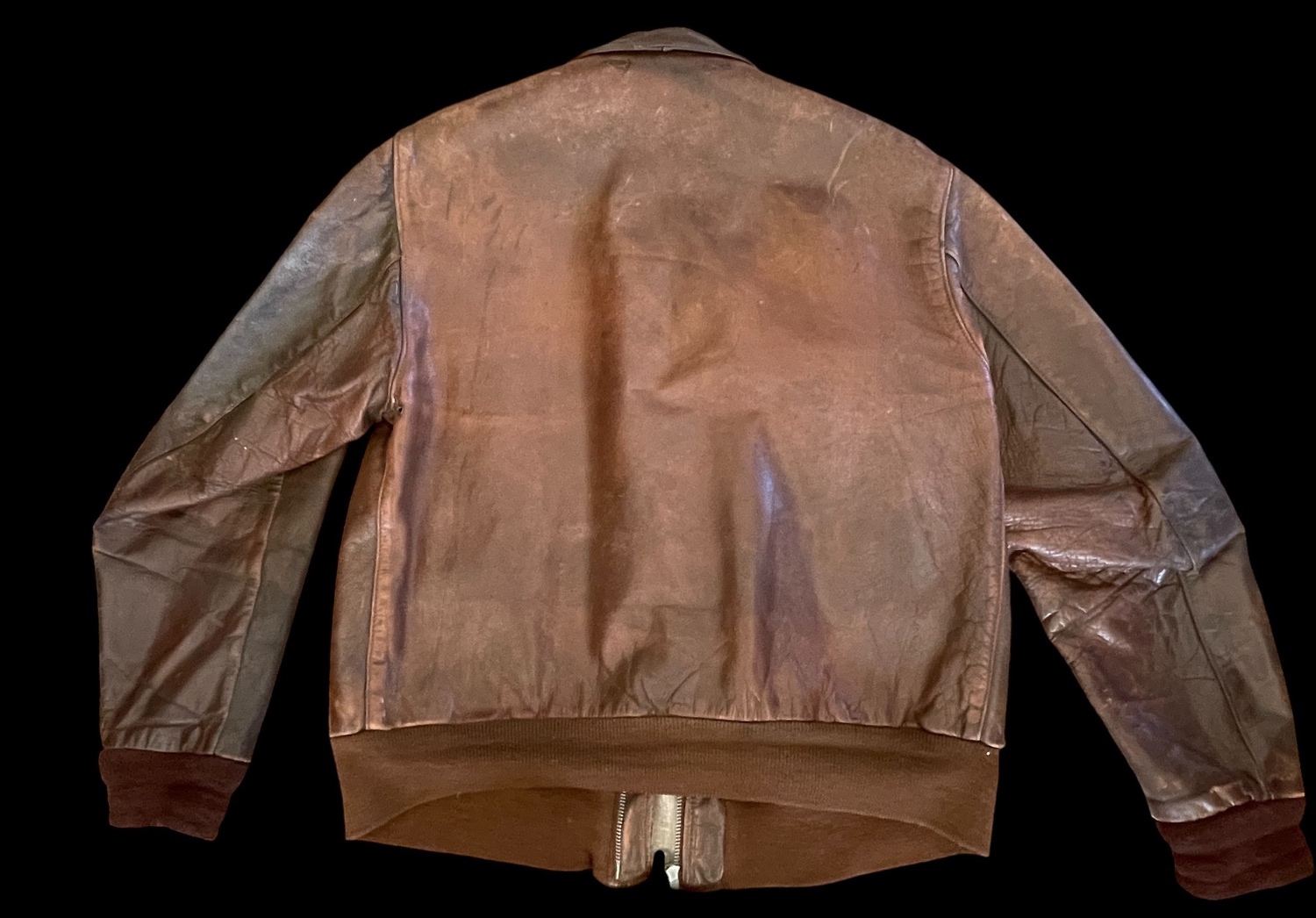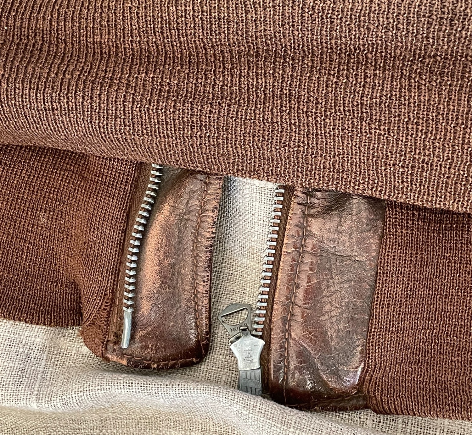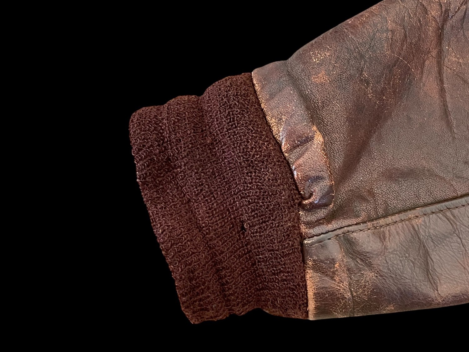 Condition: Very good overall; honest field wear with supple leather, strong color to insignia, and minor age cracks to finish. Zipper functional, knits with light wear.