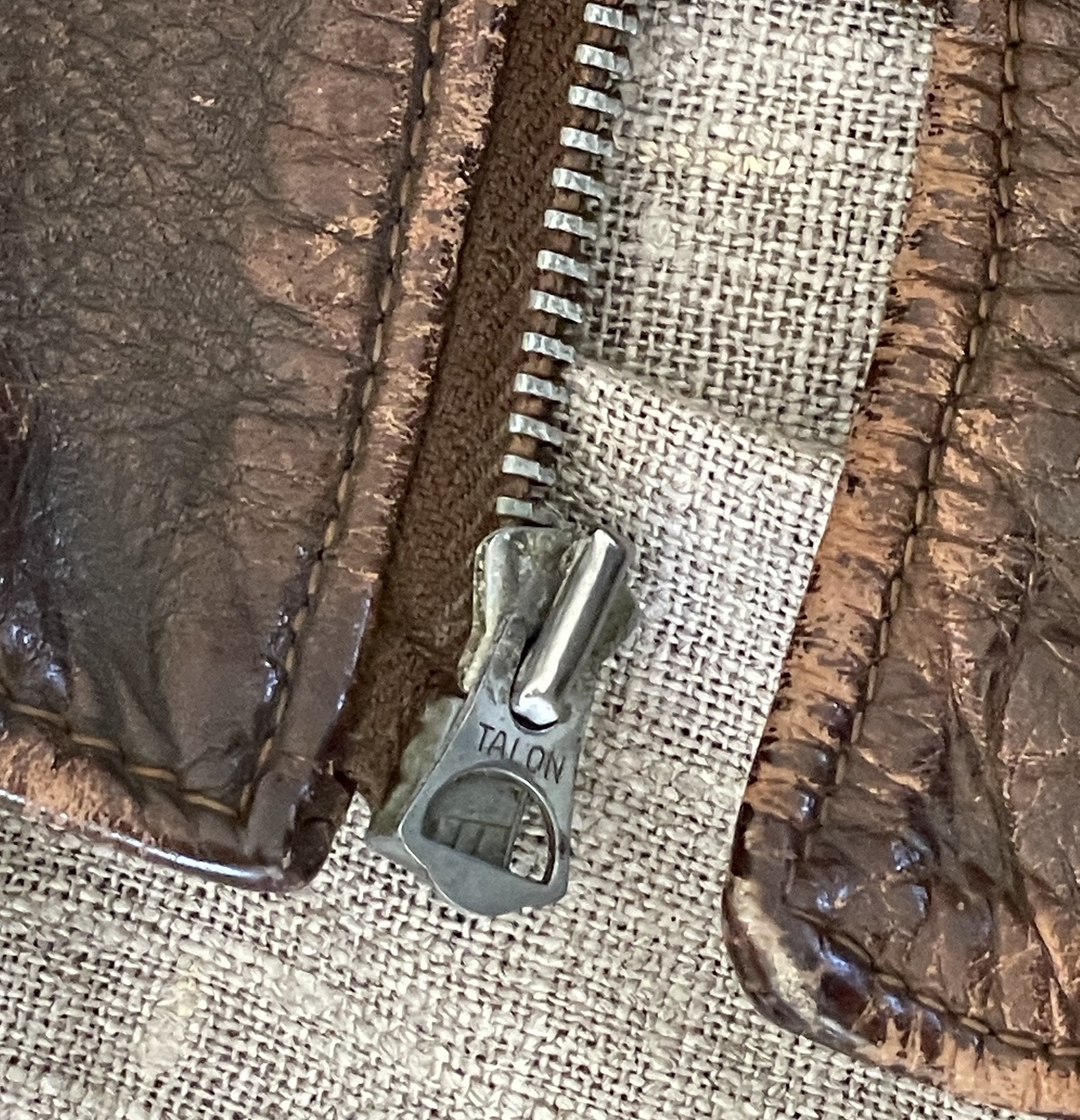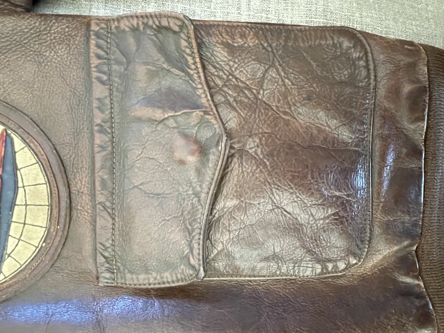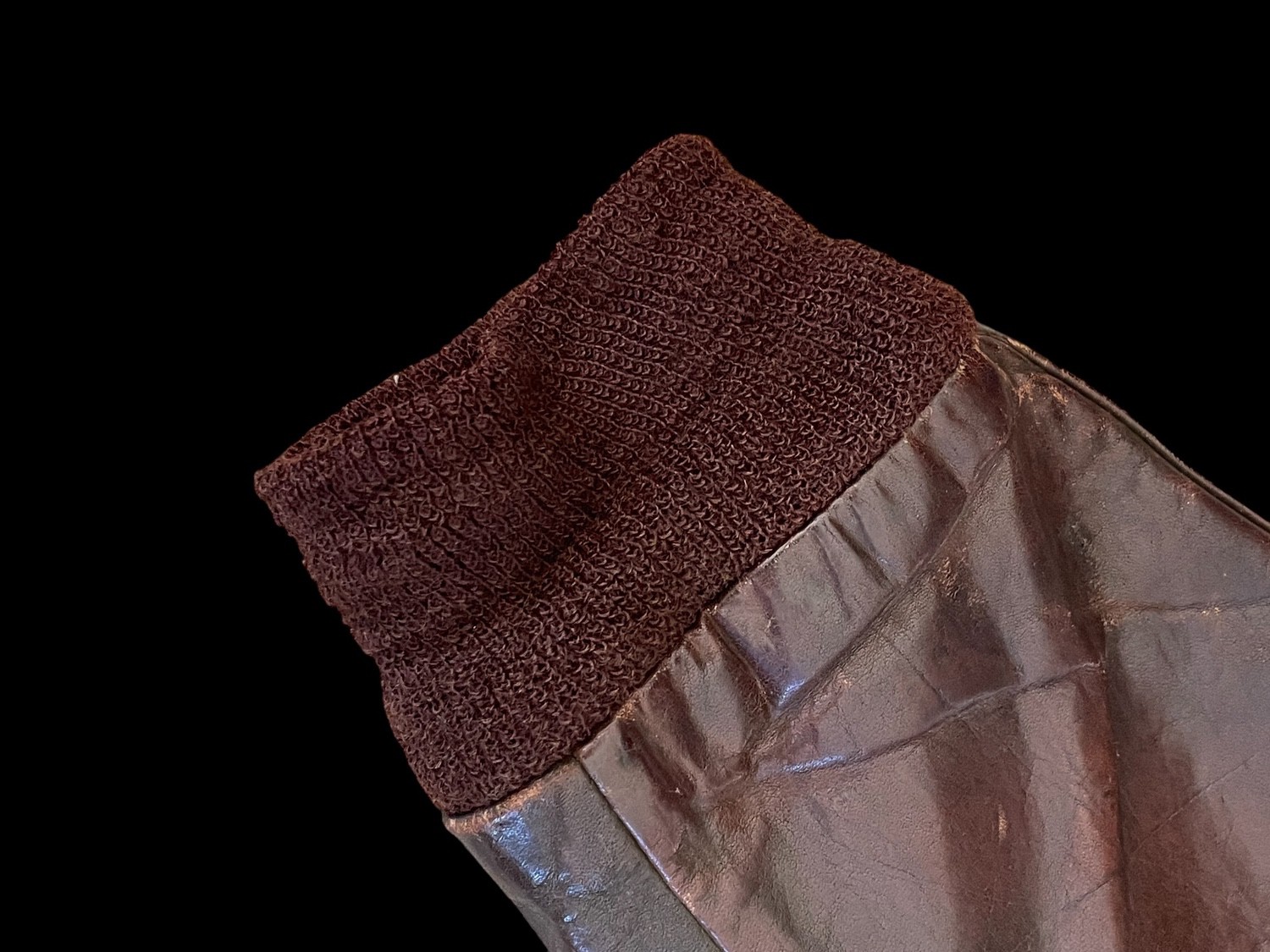 Condition: Very good overall; honest field wear with supple leather, strong color to insignia, and minor age cracks to finish. Zipper functional, knits with light wear.