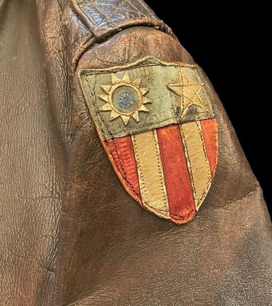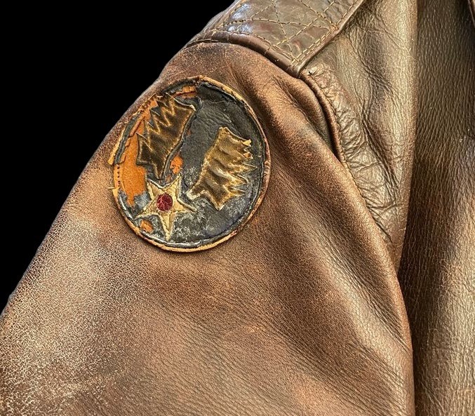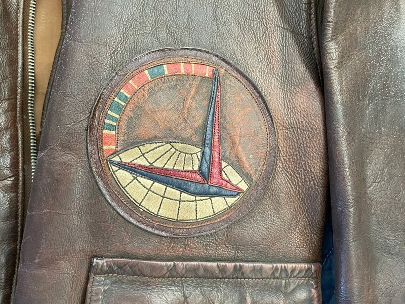 Original WWII U.S. Army Air Forces A-2 flight jacket featuring period-applied insignia to a member of the Air Transport Command ATC serving in the China-Burma-India theater. The front bears a large hand-painted leather ATC insignia depicting the commandÕs distinctive red-and-blue arrow over a gold globe, with the Army Air Forces winged-star patch sewn to the left shoulder and the CBI China-Burma-India leather patch to the right.