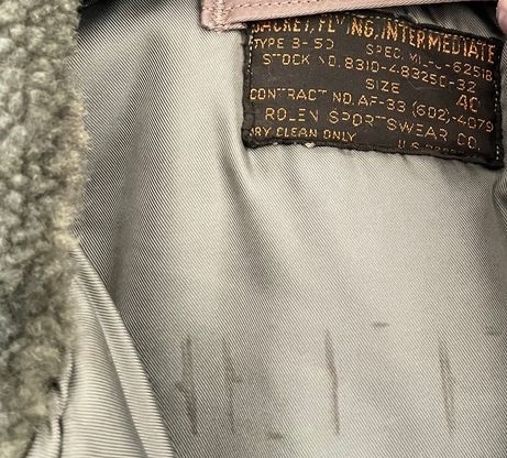 A fine example of the U.S. Air Force B-15D flight jacket, manufactured by Rolen Sportswear Co. under contract AF-33 602 -4079, in accordance with Specification MIL-J-6251B, dated 1953. This jacket represents one of the earliest standardized nylon flight garments of the Cold War, designed for intermediate flying conditions and issued to jet aircrewmen during the Korean War period.
