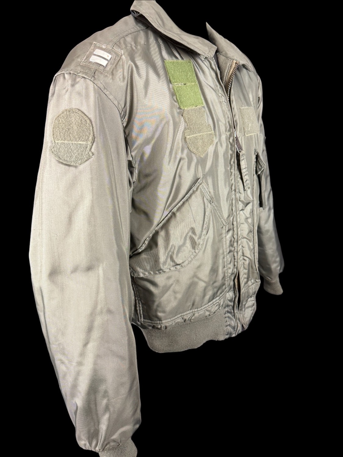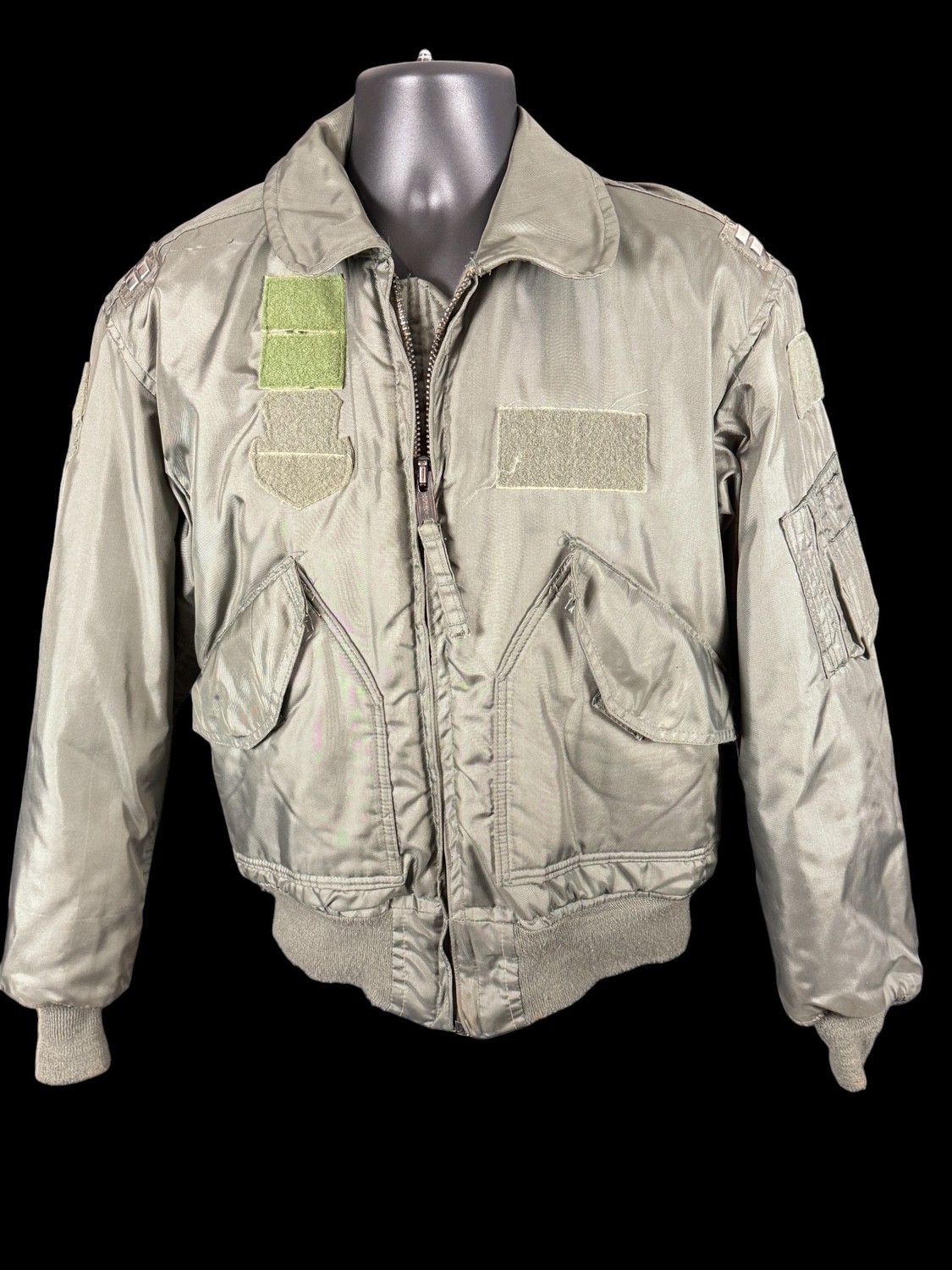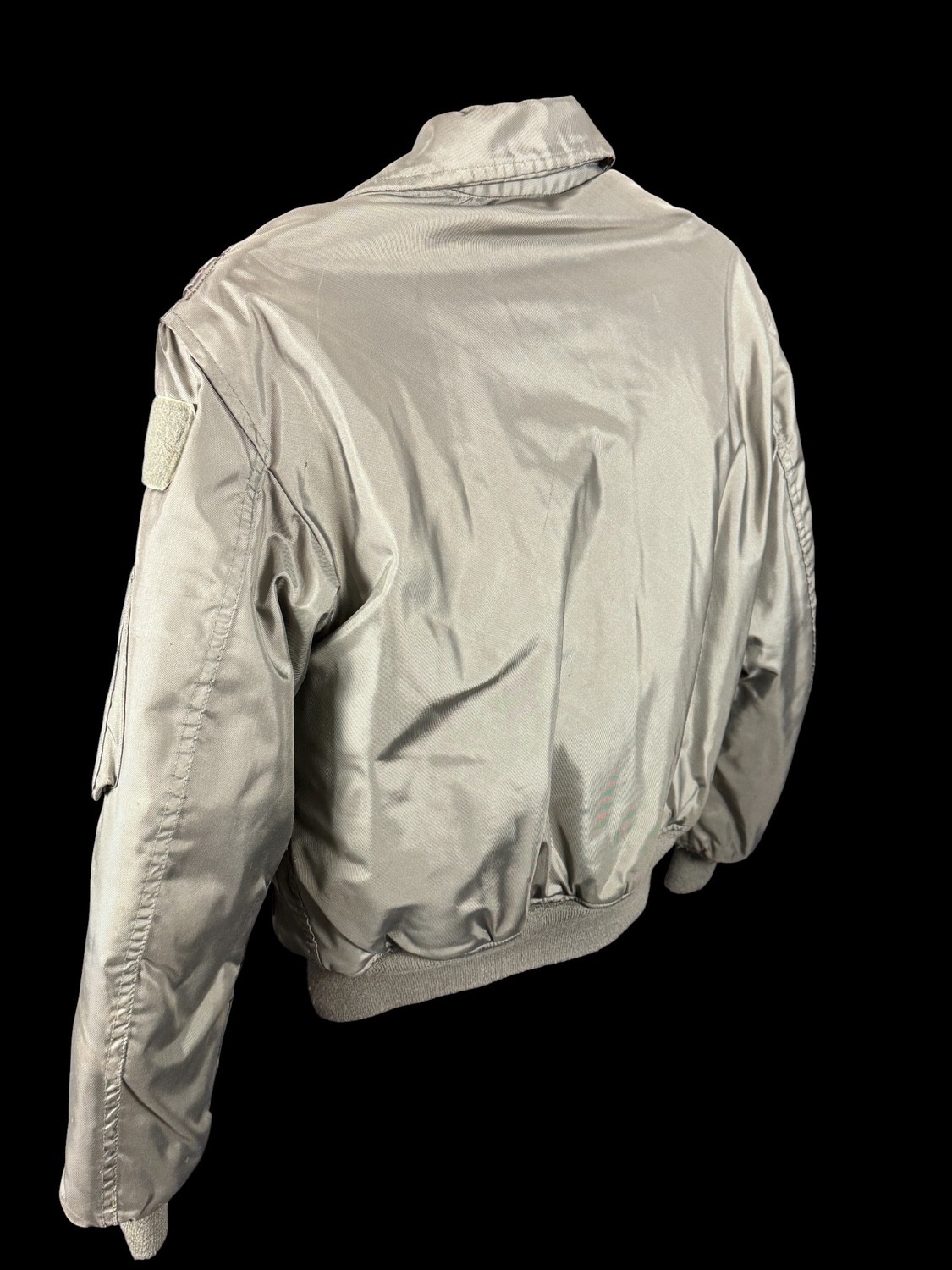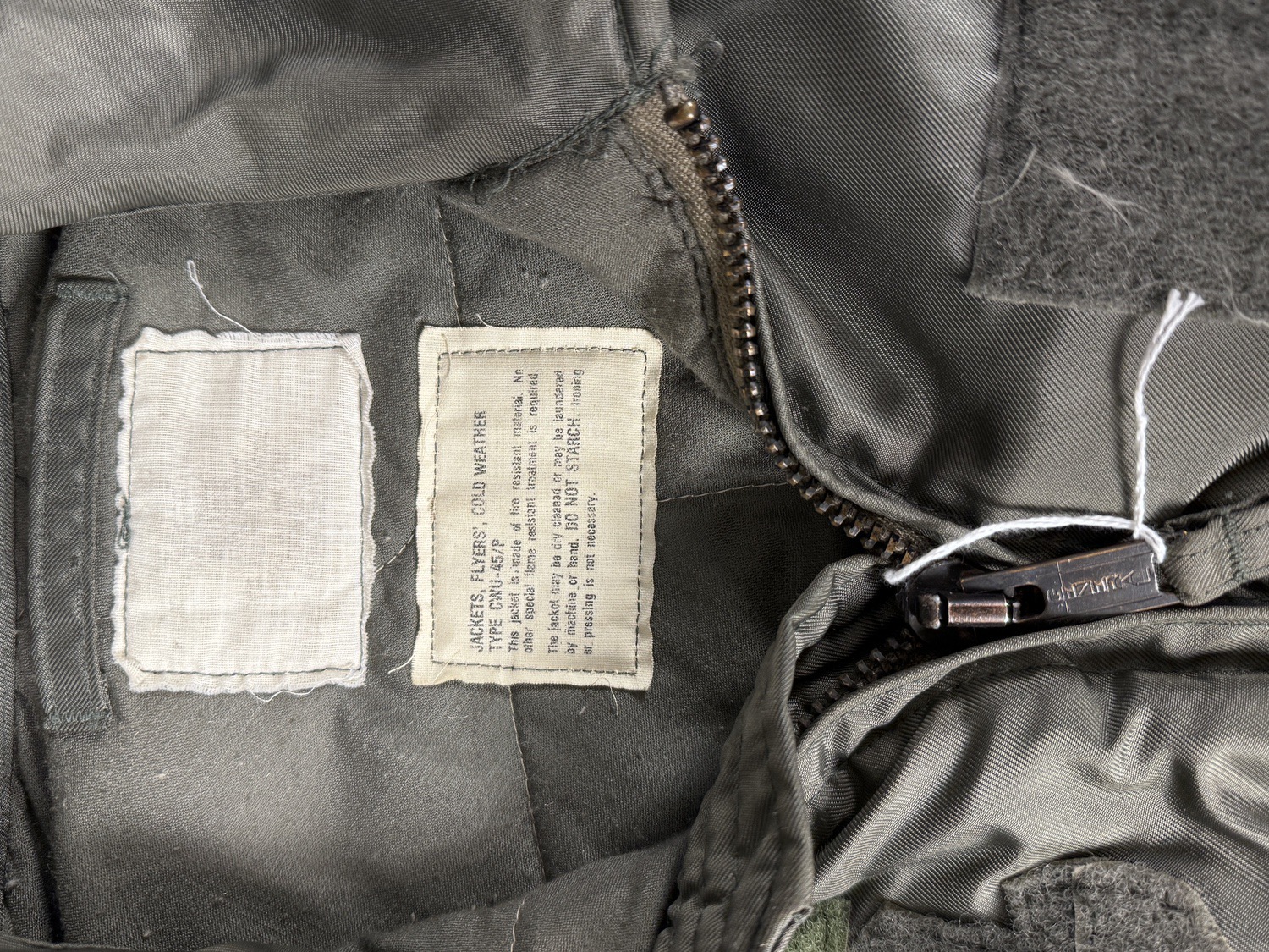 This is an authentic early-era United States Air Force Type CWU-45/P Cold Weather Flight Jacket, the garment that historically replaced the nylon MA-1 to become the standard issue cold weather flight jacket for the US military. Distinguished by its construction from fire-resistant Aramid Nomex fibers, this jacket features the distinctive -shiny- sage green sheen associated with earlier production runs before the material finish was matte-dulfed in later years. The printed white specification label is clearly legible, designating the item as -JACKETS, FLYERS , COLD WEATHER / TYPE CWU-45/P- and explicitly noting the use of fire-resistant materialÑa critical safety upgrade implemented after the Vietnam War to protect aircrews from cockpit fires.