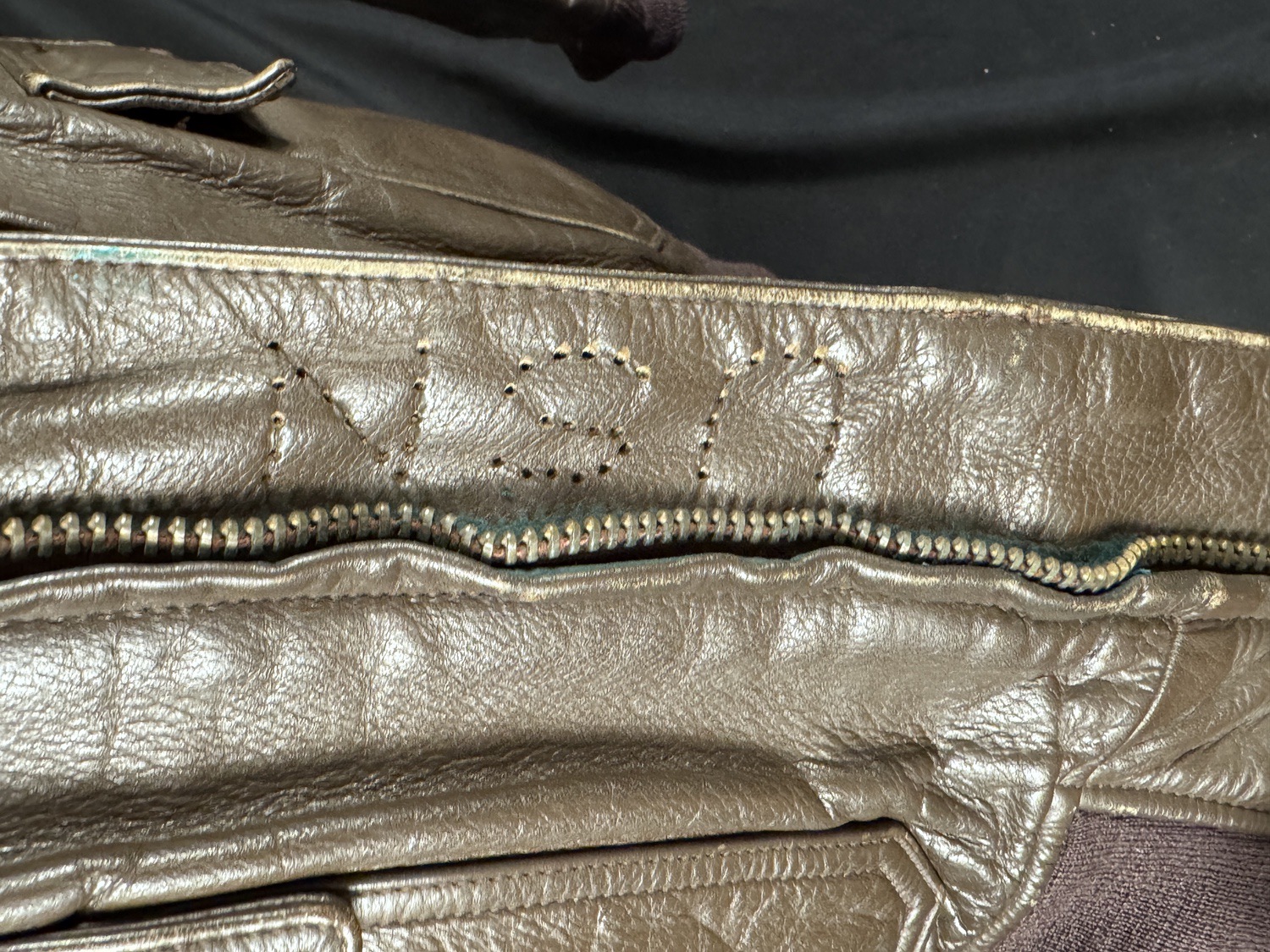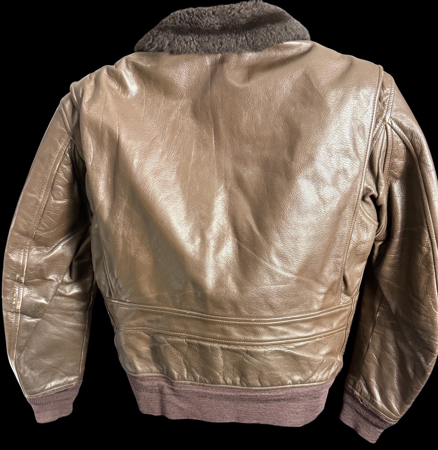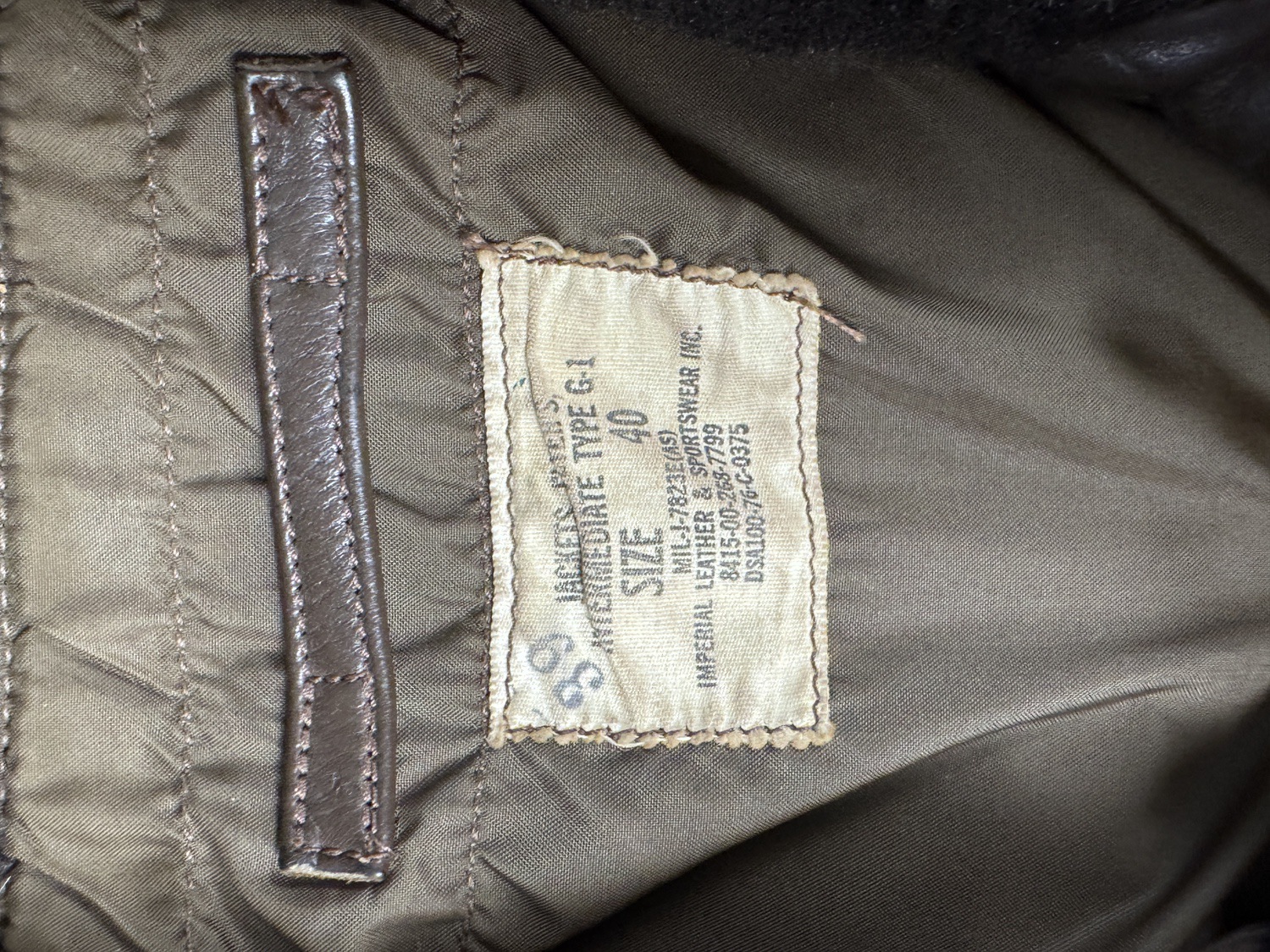 This is a prestigious and identified United States Navy Type G-1 Intermediate Flight Jacket attributed to a Test Pilot at the elite Naval Air Test Center NATC Patuxent River. Manufactured by Imperial Leather & Sportswear Inc. under the post-Vietnam era specification MIL-J-7823E AS , this jacket bears the 1976 contract number DSA100-76-C-0375. The jacket features the classic dark brown goatskin leather construction, the period-correct synthetic -dynel- fur collar standardized in the E-series , and the distinctive -USN- perforation punched into the wind flapÑa hallmark of authentic G-1s from this era.