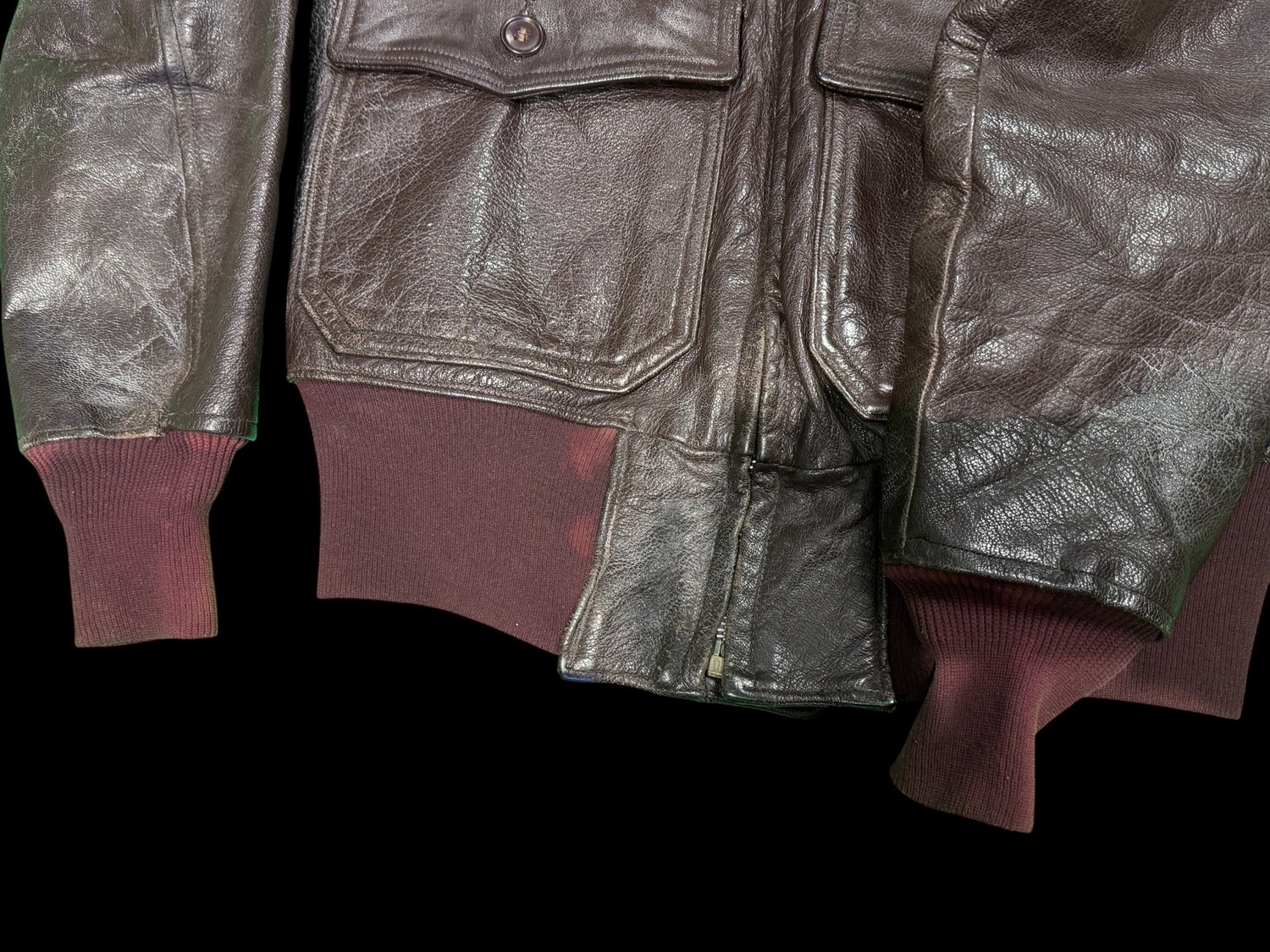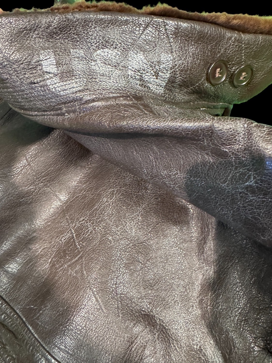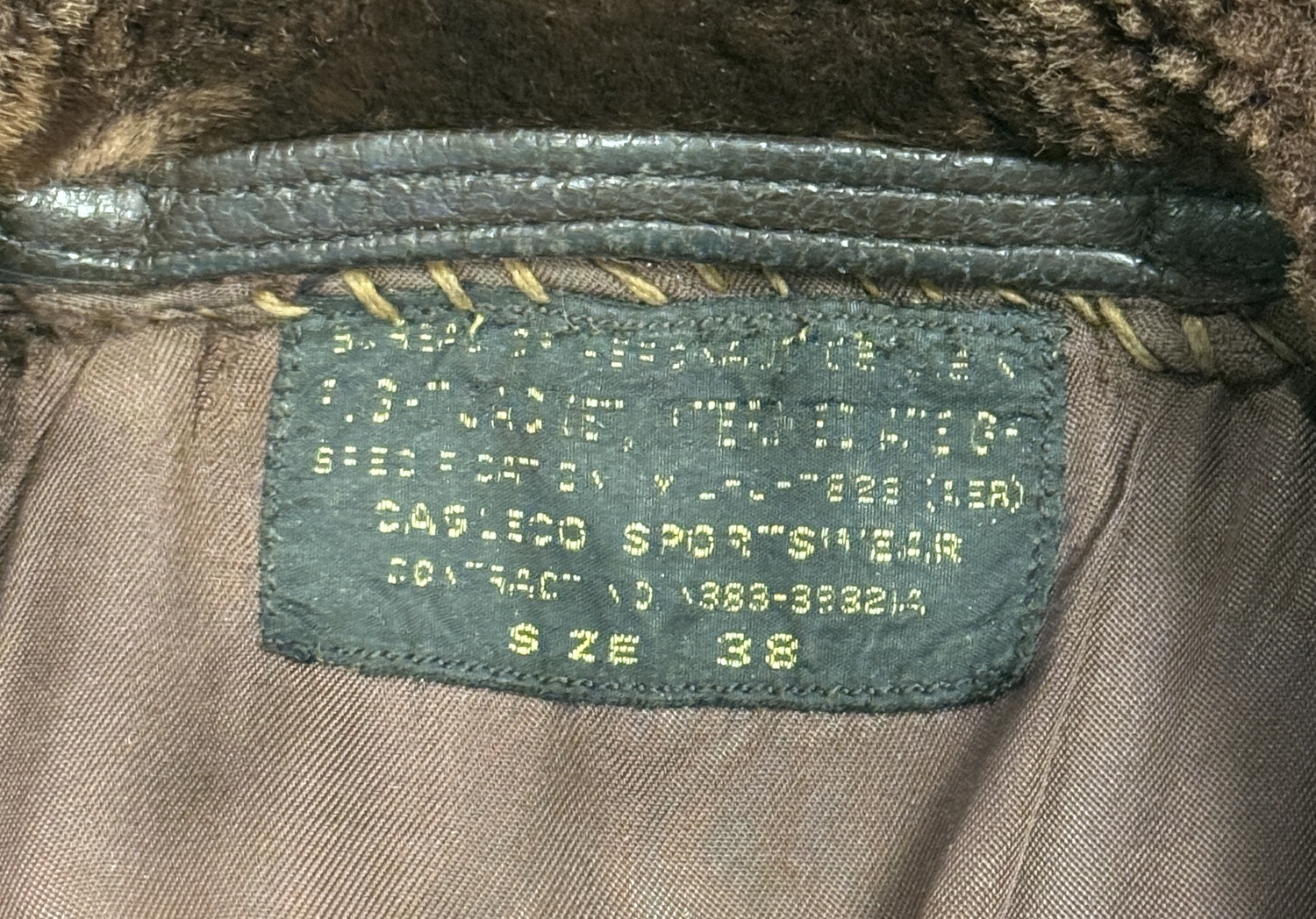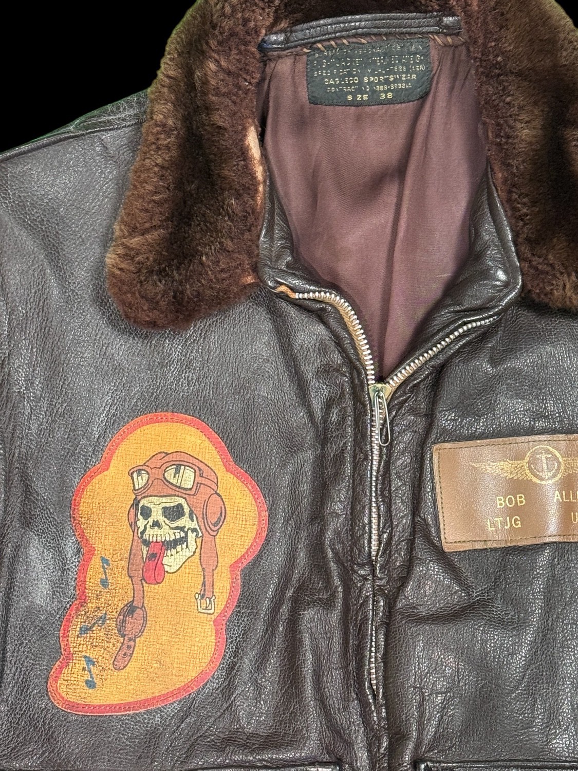 This is an exceptionally rare and historically fascinating United States Navy Type G-1 Flight Jacket that documents a unique cross-service history during the Cold War. Manufactured by Cagleco Sportswear under the 1957 contract N383-39321A Spec MIL-J-7823 AER , this jacket is identified to Lieutenant jg Bob Allen, a US Naval Reserve aviator. The jacket itself is a classic mid-50s G-1, featuring a dark brown goatskin shell, a genuine mouton fur collar, and the perforated -USN- wind flap.
