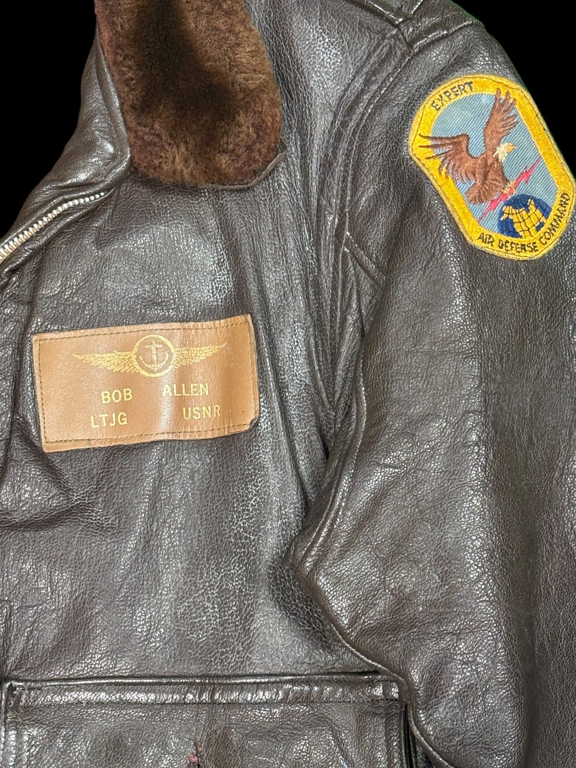 Adding to the intrigue is the patch on the left shoulder: an -Expert- variant of the USAF Air Defense Command ADC insignia. The presence of a Navy pilot LTJG Allen wearing a Marine Squadron patch VMF-514 along with an Air Force qualification patch is highly unusual. It suggests LTJG Allen was likely involved in a cross-service exchange program or that VMF-514 was integrated into the Continental Air Defense mission, participating in USAF-adjudicated gunnery or rocketry competitions such as -William Tell.- The jacket shows honest service wear with some scuffing to the leather, and the wool knits appear to be period replacements with a distinctive reddish-brown hue often seen in depot repairs of the era.