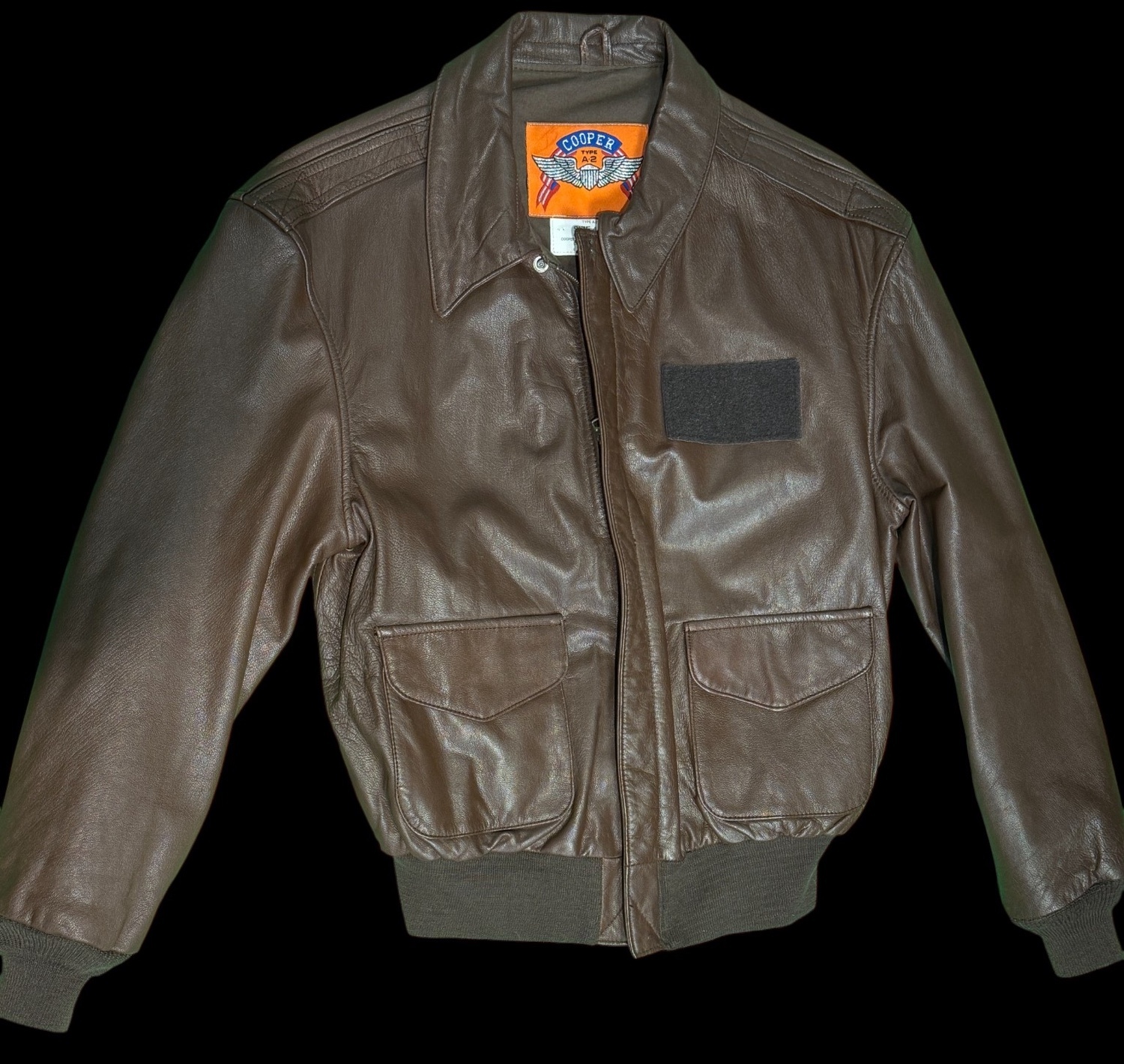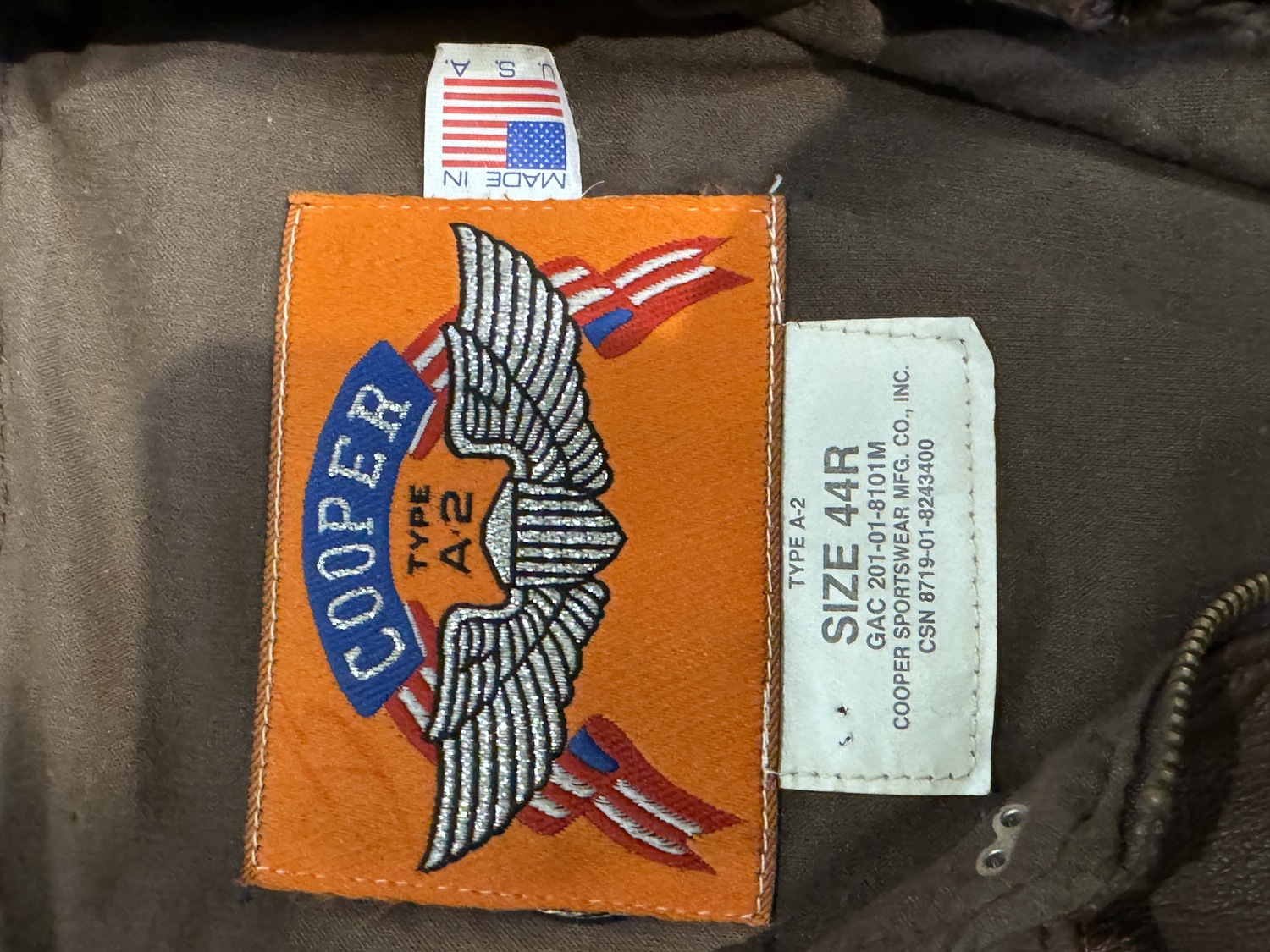 his is a high-quality modern era reproduction of the legendary United States Army Air Forces Type A-2 Flight Jacket manufactured by Cooper Sportswear Mfg. Co. Inc. While Cooper was an original wartime contractor this specific garment dates to the modern era likely the late 1980s or 1990s following the United States Air Force s decision to reintroduce the leather A-2 to service in 1988. Constructed from durable dark brown goatskin leather this jacket adheres to the classic military configuration with snap-down collar epaulets and dual patch pockets but features the modern addition of a velcro hook-and-loop panel on the left chest for a removable leather name tag. The interior features the iconic orange and blue Cooper winged label alongside a white specification tag reading Size 44R GAC 201-01-8101M. Proudly marked Made in U.S.A. this jacket offers the classic aesthetic of the Flying Tigers era with the robust construction of modern manufacturing making it an ideal daily wearer for the aviation enthusiast.