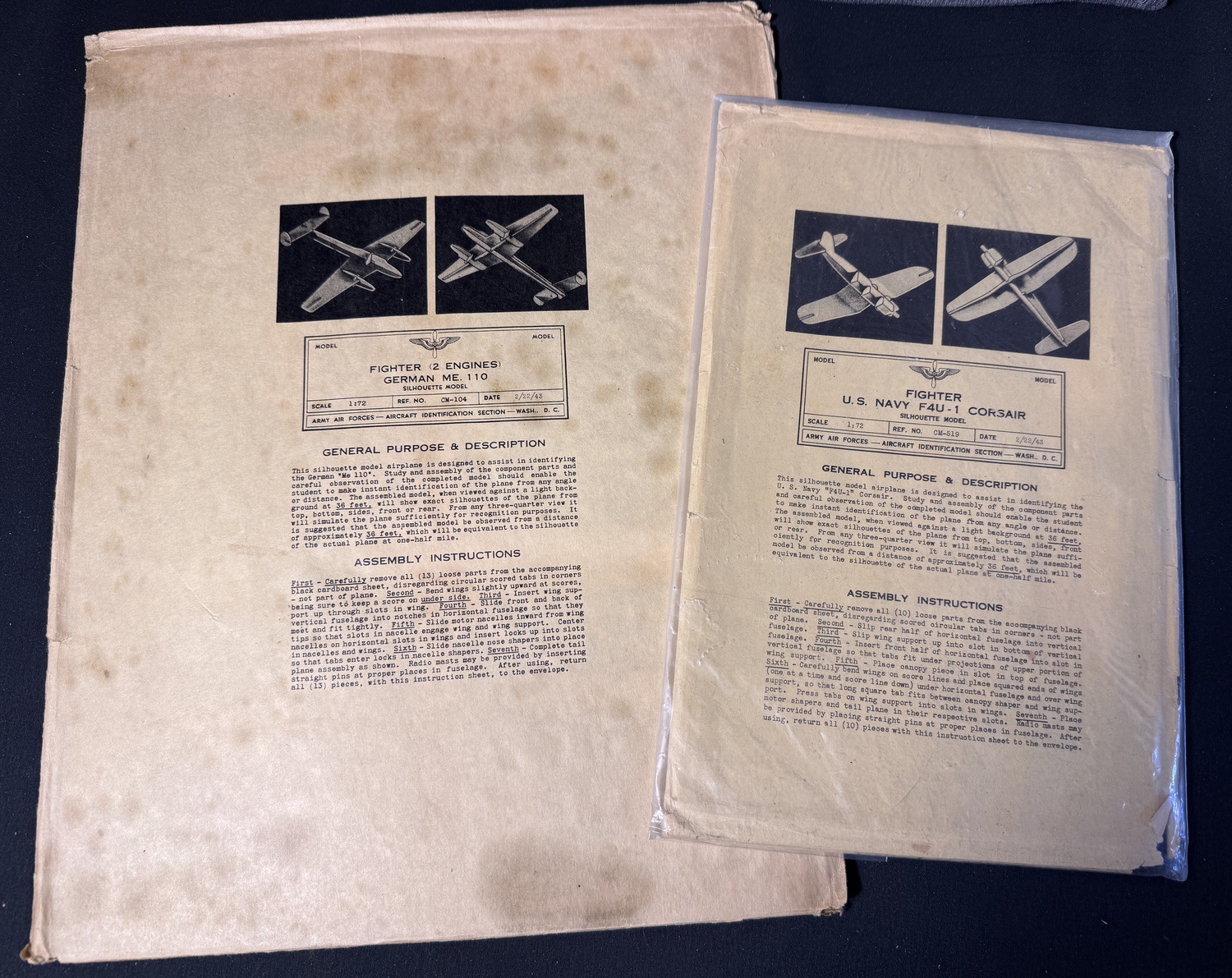 This lot consists of two vintage, unbuilt aircraft recognition model kits produced during the World War II era, specifically designed for military and civilian personnel training in aircraft identification. Both kits were manufactured by the Bureau of Aeronautics Aircraft Identification Section in Washington, D.C., highlighting their official government provenance as authentic WWII training aids. The first kit is for the Fighter – 2 Engines: German Me 110 Messerschmitt Bf 110, identified as Model No. I-17B, which includes its instructional sheet detailing the assembly of the twin-engine enemy fighter. The second kit is for the Fighter: U.S. Navy F4U Corsair, identified as Model No. CB-29, which details the construction of the recognizable American naval fighter. Both kits feature instructional diagrams and texts detailing their purpose and assembly, with all necessary pieces, typically die-cut wood or cardboard, contained within their respective original paper envelopes, making them rare and important historical artifacts.