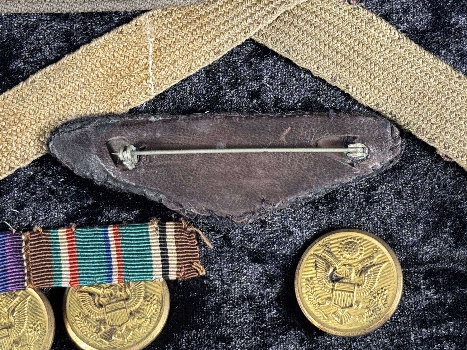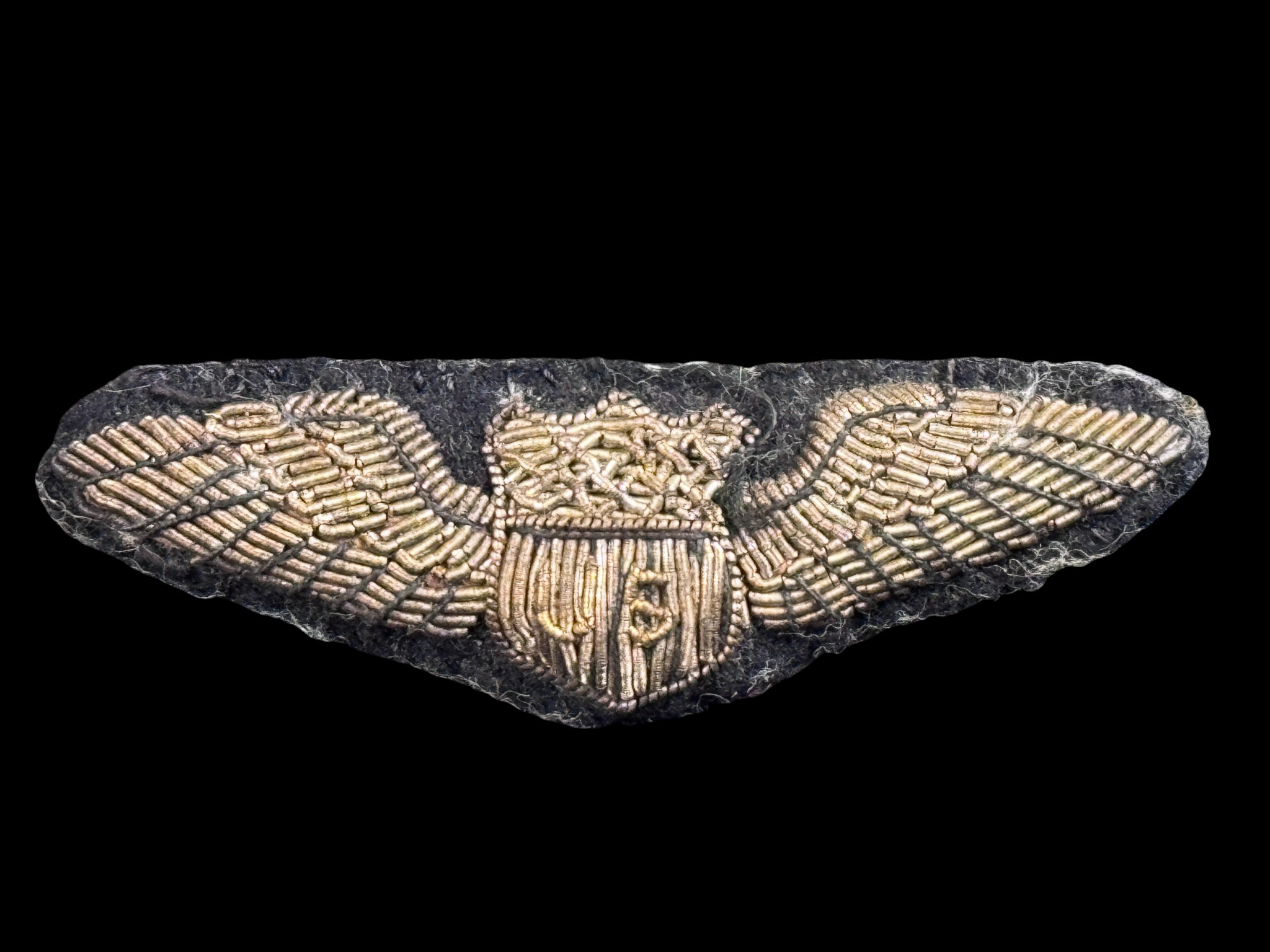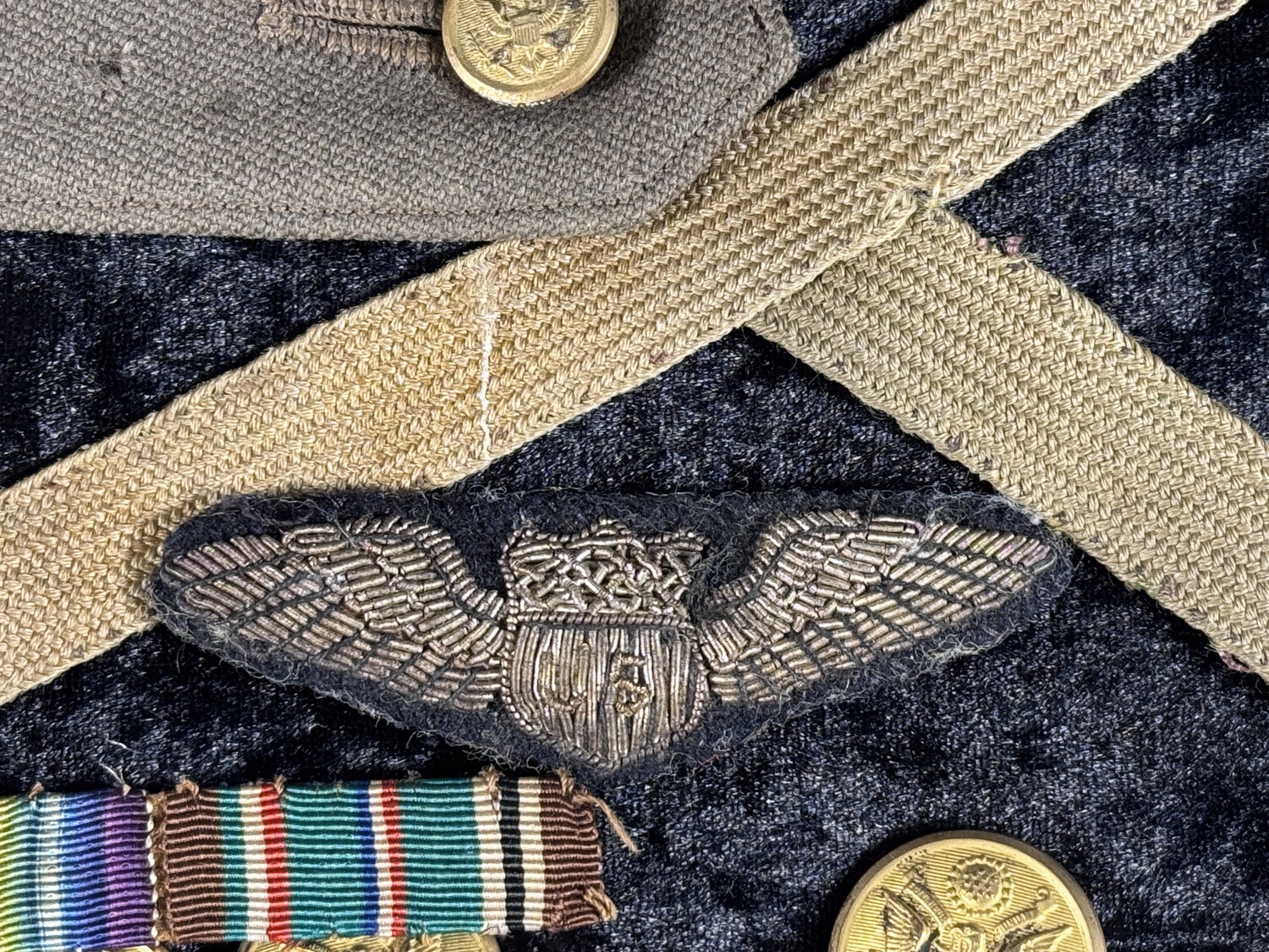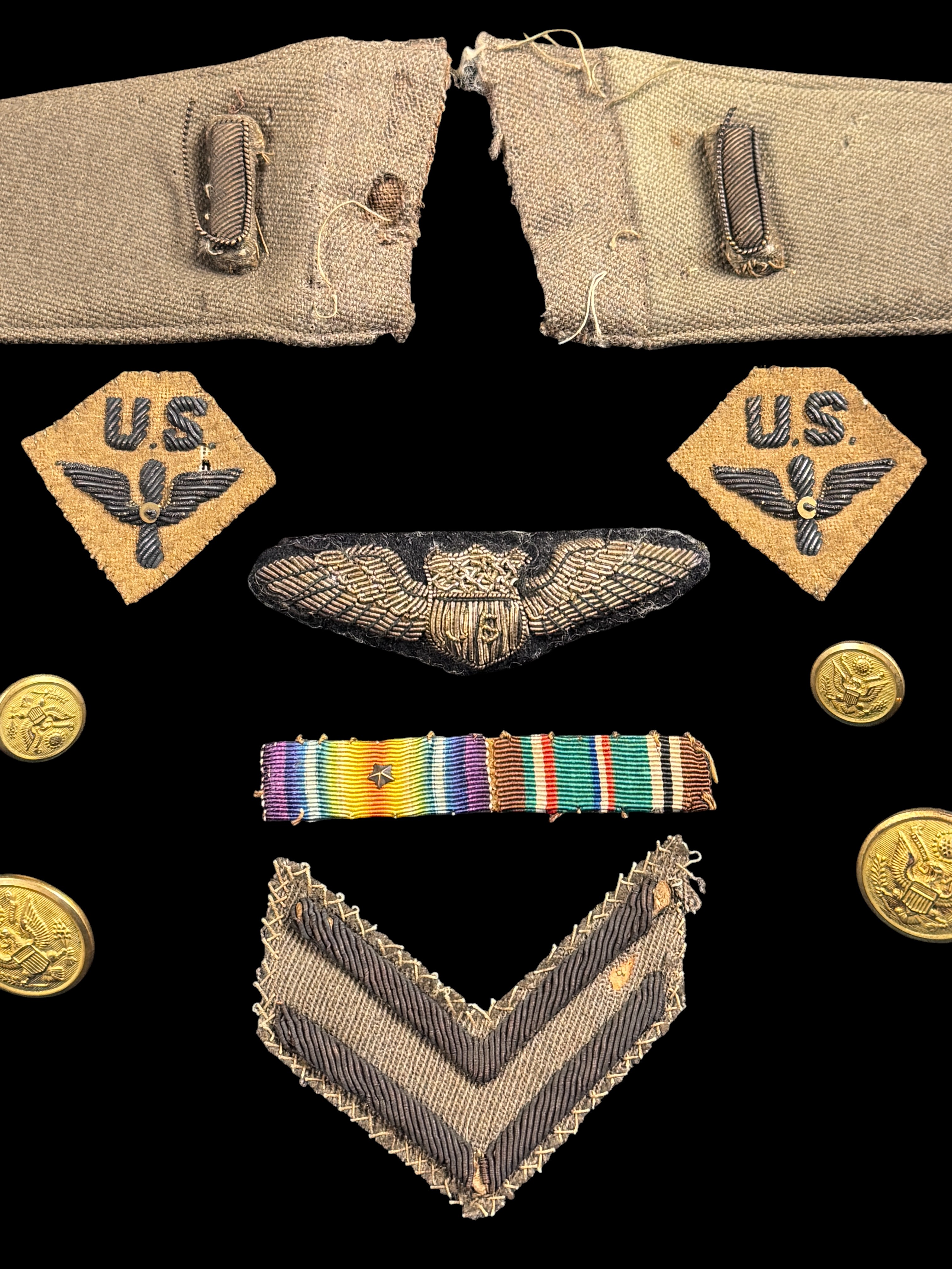 The centerpiece is a rare bullion embroidered pilot wing device, constructed with intricate silver bullion thread on a dark backing, featuring a central shield capped by an eagle and an ornate crown. This style of wing, backed with stitched leather and secured by a period-correct pinback fastener, is characteristic of highly desirable, privately purchased or theatre-made wings worn by pilots in the early US Army Air Service and Air Corps eras. The group also includes two gray-khaki uniform shoulder straps, multiple brass buttons featuring the US eagle seal, two embroidered US collar patches with the winged propeller device of the Army Air Corps, a specialist rank chevron, and a miniature ribbon bar with campaign awards. The accompanying obituary confirms Mr. Perry volunteered for active duty in World War II as a Major and served as Provost Marshal in London, making this collection a rare and complete artifact spanning the full arc of early American military aviation history.