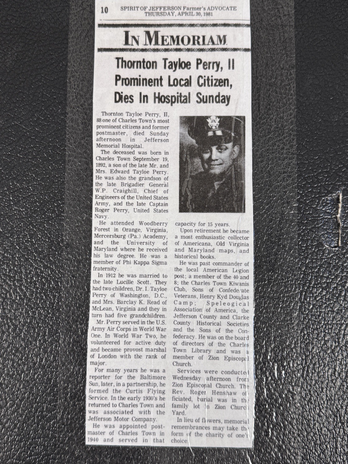 This lot comprises a significant grouping of US Army Air Corps AAF pilot insignia and associated memorabilia directly linked to Major Thornton Tayloe Perry II 1892Ð1981, as confirmed by the included April 30, 1981 obituary. Mr. Perry was a prominent figure whose military service spanned both the First World War and the Second World War, connecting him to the earliest days of American military aviation. Perry entered the U.S. Army Air Corps during WWI and continued his lifelong connection to flight post-war, reportedly engaging in barnstorming and later associating with the Curtis Flying Service in the early 1930s.