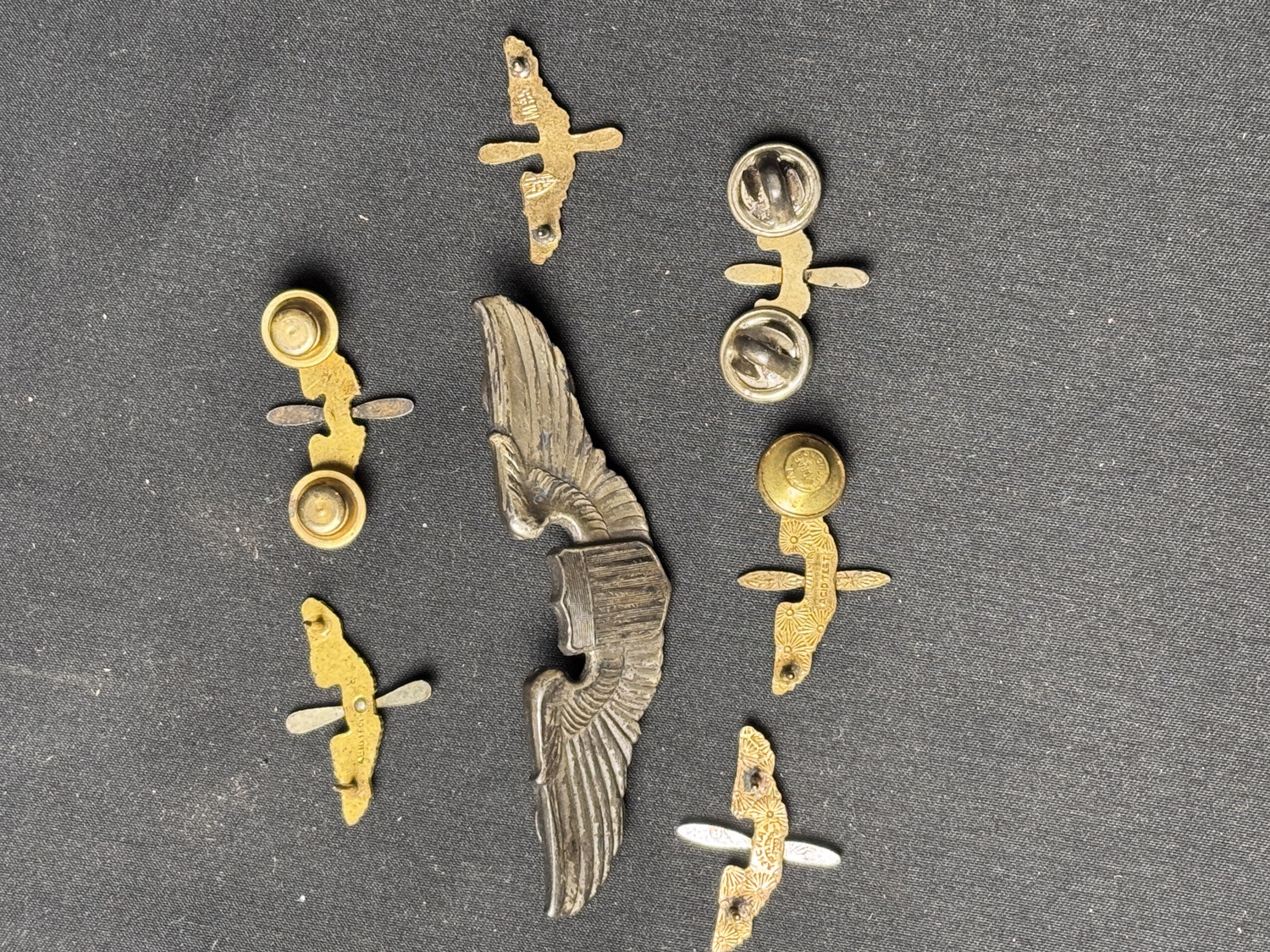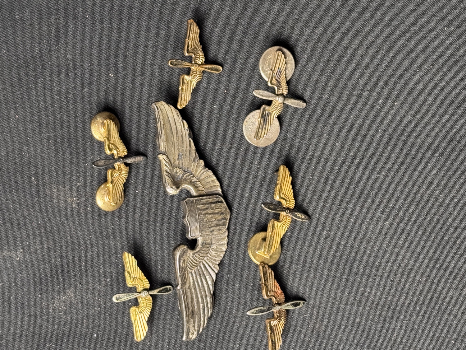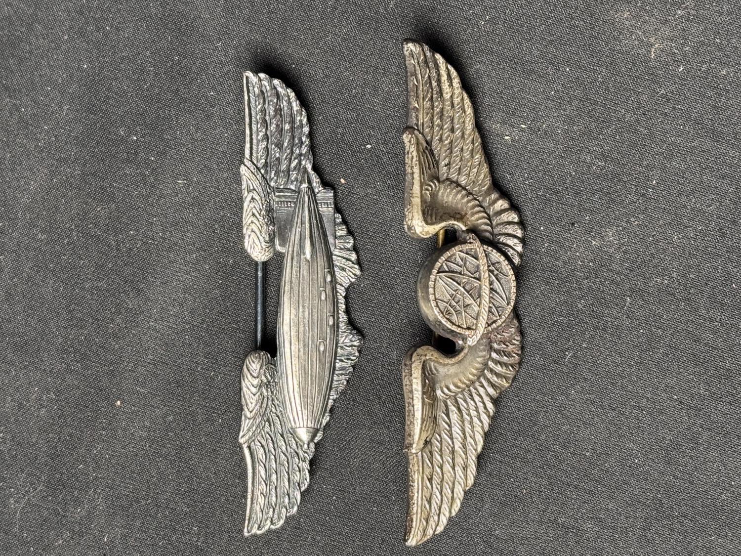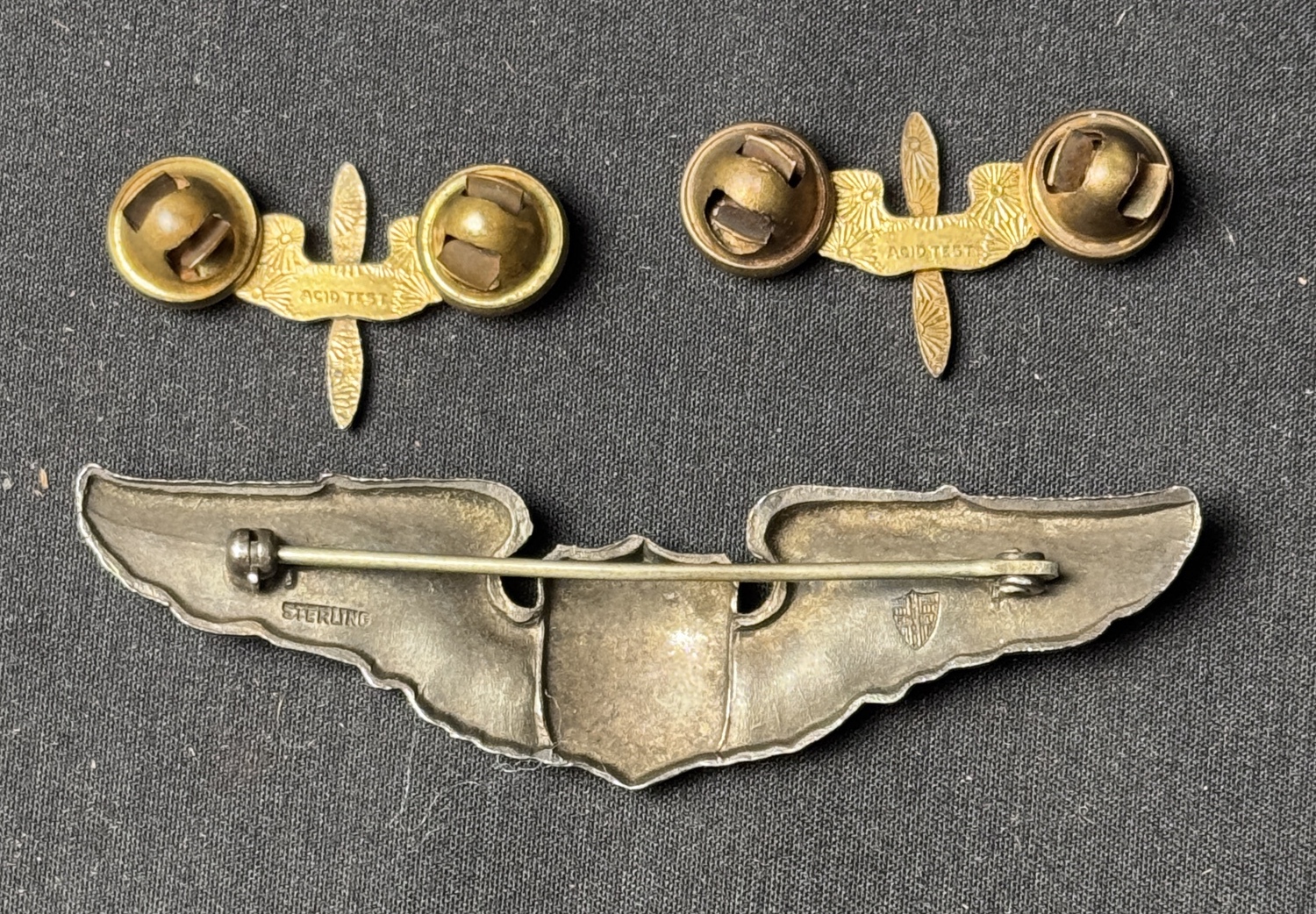 PB sterling marked 3in wings made by Meyers. Original thick pattern. Includes two full-sized 3in. Wings. British-Style Navigator Wings and Early Airship Pilots wings. Also eight AAF Officers collar insignia with at least two matched sets. The Navigator and Airship wings are likely fantasy pieces. The Sterling Pilots wings are original.