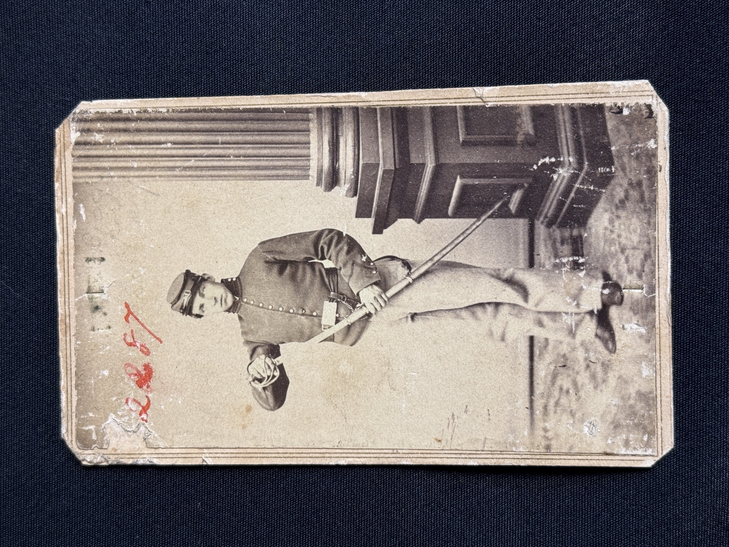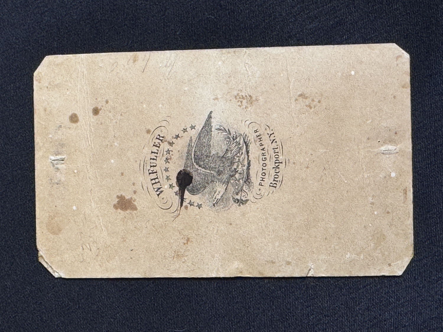 This is an authentic mid-19th century Carte de Visite CDV photograph depicting a young Union soldier from the American Civil War era, identifiable by his uniform and accoutrements. The soldier is shown in a full-length studio pose, wearing a standard Union military frock coat with brass buttons, light-colored trousers, and a forage cap, and he appears to be wearing a dark leather belt with a buckle and a cap pouch. He strikes a formal, slightly dramatic pose, holding a cavalry saber or officer s sword pointed toward the ground, resting his left hand on the sword grip. The studio setting features common Victorian photographic backdrops, including a large column and pedestal. The reverse of the card confirms the photographer as W. H. Fuller, Photographer, Brockport, N.Y., which establishes the photograph s geographical origin near Rochester, New York, a region that supplied numerous regiments to the Union Army. The CDV format and the subject s uniform firmly date this photograph to the 1860s, making it a desirable piece of Civil War history and military photography.