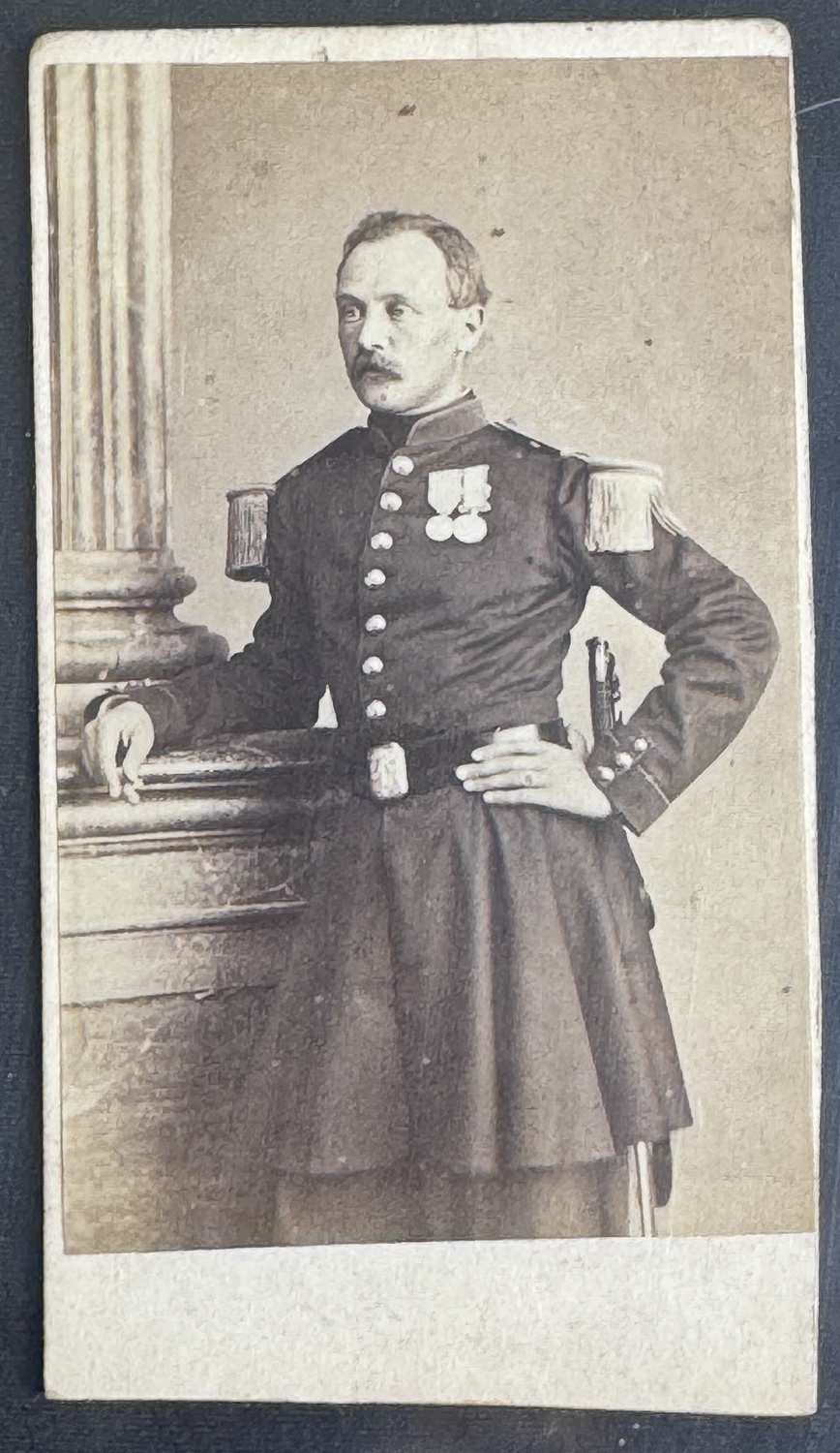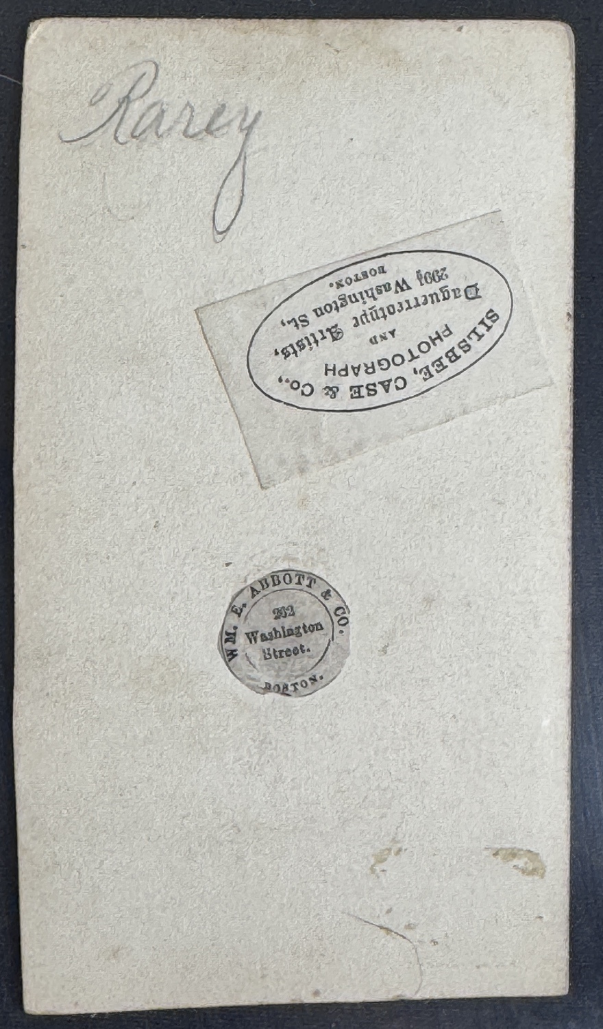 This is a rare and compelling Carte de Visite CDV photograph, likely dating from the 1860s, depicting a distinguished officer wearing a uniform strongly resembling those worn by French or Zouave style units. The officer is shown in a three-quarter length studio pose, leaning on a classical column. He wears a dark, skirted frock coat or tunic featuring multiple buttons, and distinctive, fringed epaulets on the shoulders, suggesting a high or non-commissioned officer rank. His dark uniform and skirted coat are characteristic of the French-influenced uniforms popular in the mid-19th century, particularly among some Union and Confederate Zouave regiments during the American Civil War. Significantly, the officer is wearing two visible military medals pinned to his chest, indicating combat service or distinction. The reverse of the card features two different studio imprints from Boston, Massachusetts: a circular stamp for Wm. E. Abbott & Co. and an oval stamp for Silsbee, Case & Co. The handwriting on the back reads Roney or Rarey, which may be the soldier s name or a later collector note. This photograph is a valuable and unusual piece of military portraiture due to the officer s decorated status and the unique combination of the Zouave-style uniform and Boston photographic provenance.