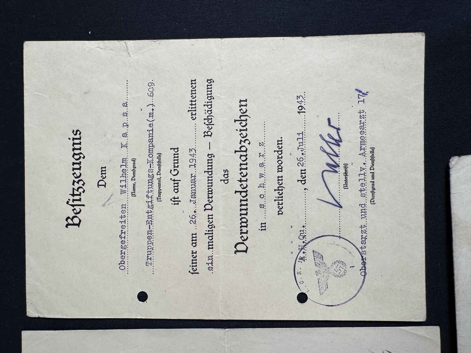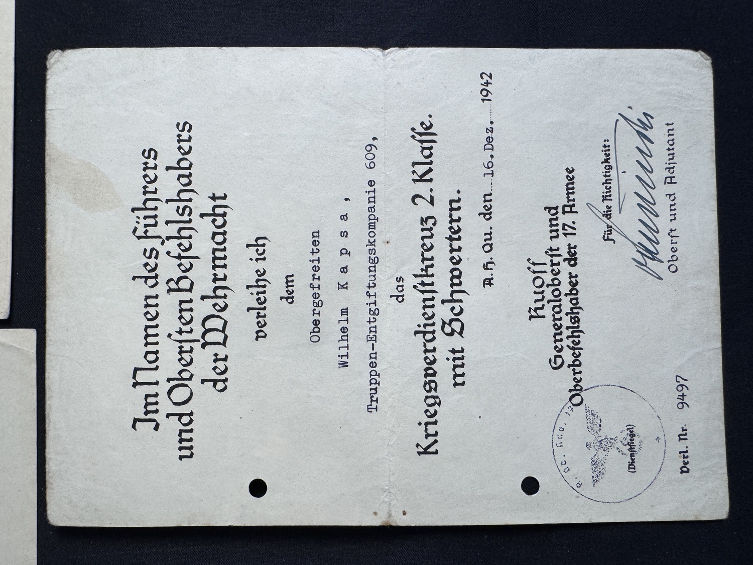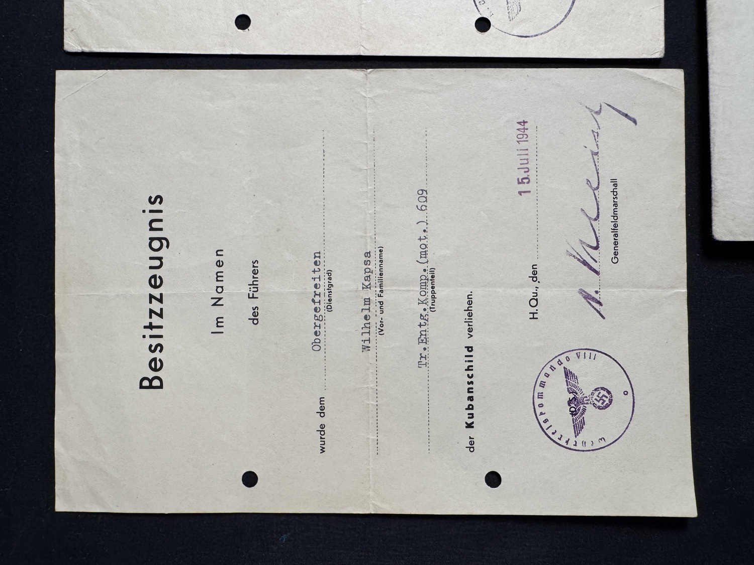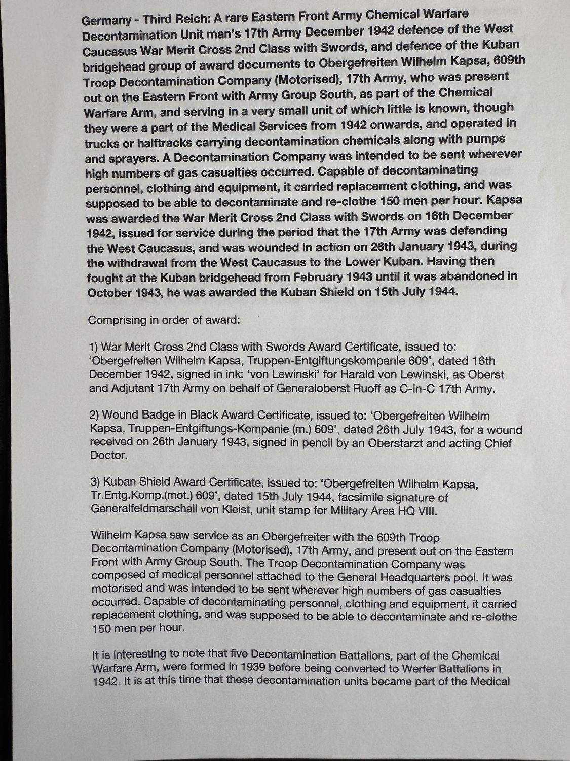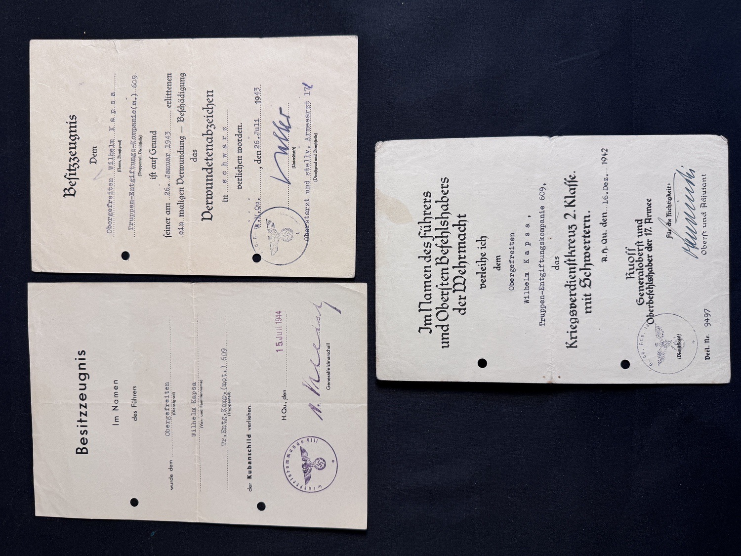 This is a rare and historically significant grouping of three original German World War II award documents belonging to Obergefreiten Wilhelm Kapsa of the Truppen-Entgiftungskompanie mot. 609 Decontamination Troop Company Motorized 609. This unit was part of the 17th Army Chemical Warfare Arm and Medical Services, a rare and specialized branch of the Wehrmacht operating on the Eastern Front, responsible for neutralizing gas attack damage and decontaminating equipment. The grouping comprises three Besitzeugnis documents, all named to Wilhelm Kapsa: the War Merit Cross 2nd Class with Swords, awarded in December 1942 for service during the defense of the West Caucasus; the Wound Badge in Black, awarded in July 1943 for a wound suffered during the 17th Army s withdrawal from the West Caucasus; and the Kuban Shield, awarded in July 1944 for participation in the intense fighting to hold the Kuban bridgehead. The complete set of three original awards, detailing service in a rare Wehrmacht unit and signed by high-ranking commanders, provides a tangible and detailed record of a German soldier s experience in the brutal, defensive battles on the Eastern Front, particularly the critical Caucasus and Kuban campaigns of 1942-1943.